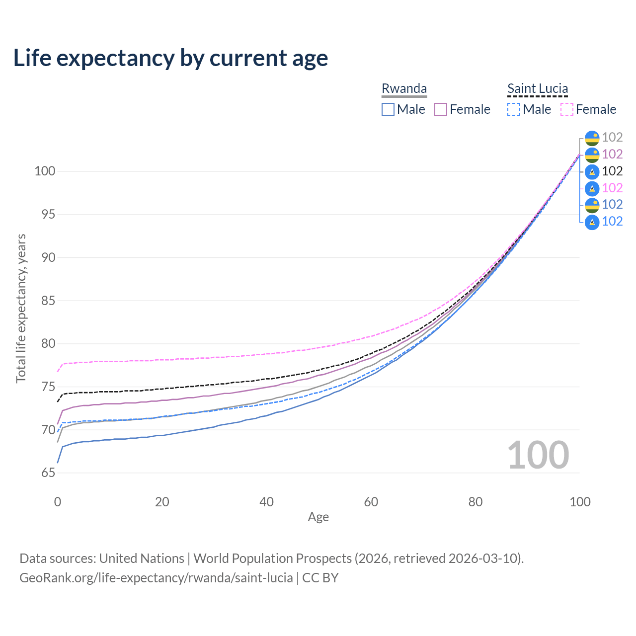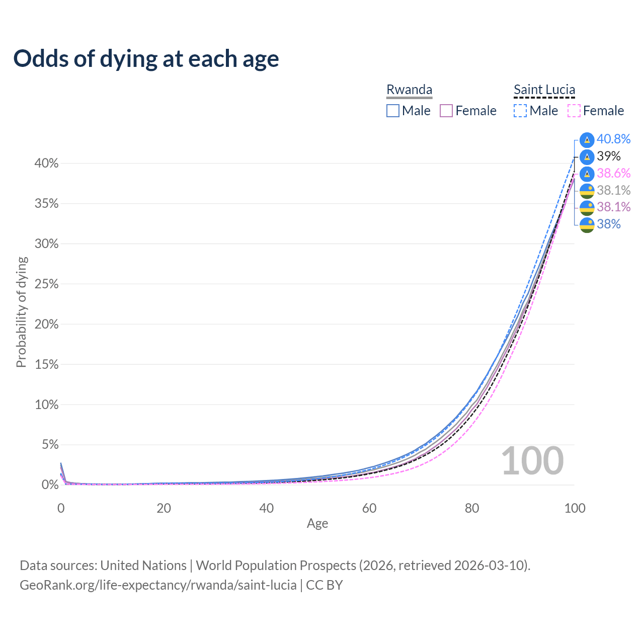 This life expectancy calculator shows the odds of living to 100, 95, 90, and below based on current age for both males and females in Rwanda and Saint Lucia, along with mean and median age of death. The calculations are based on the 2026 life tables (actuarial tables) from the UN World Population Prospects.