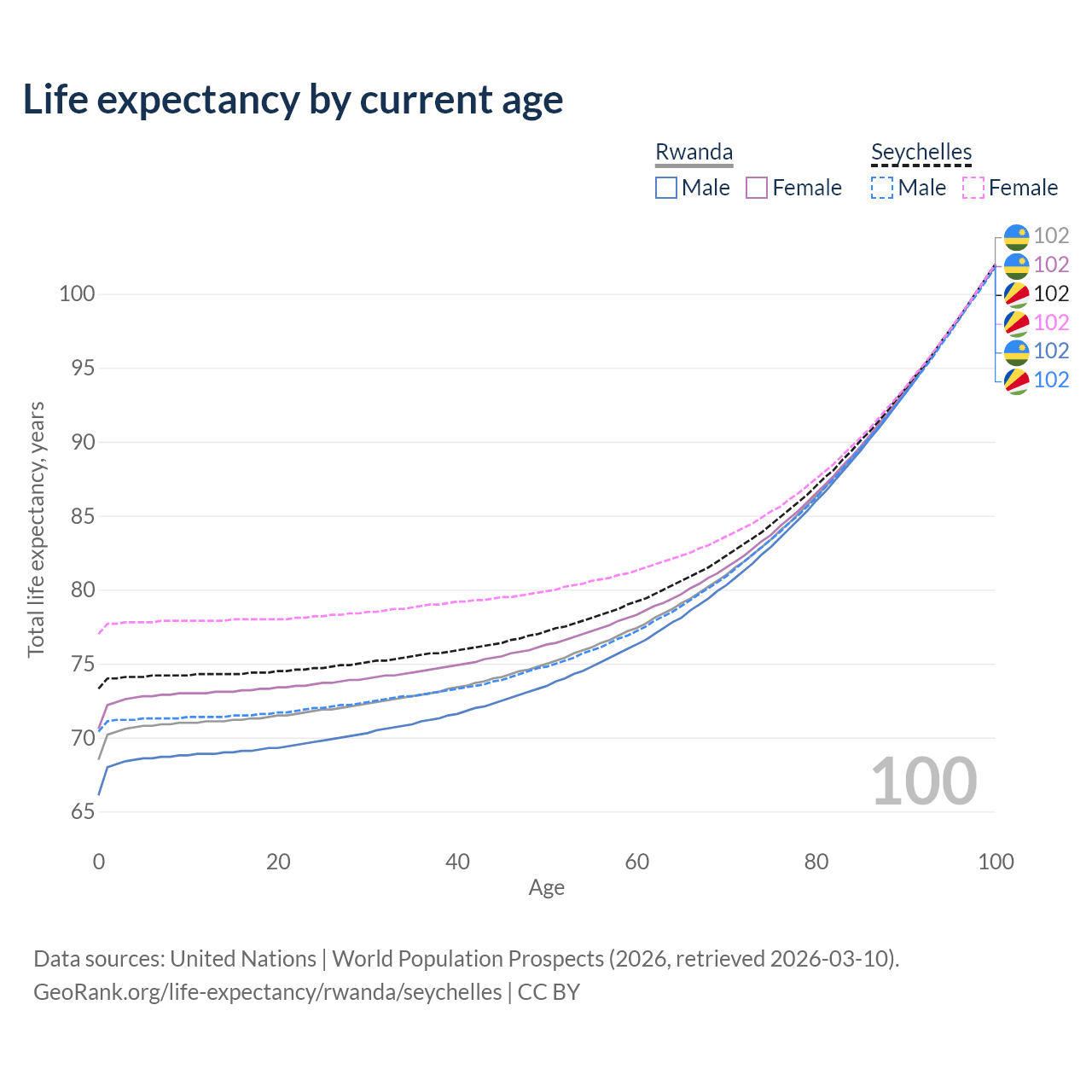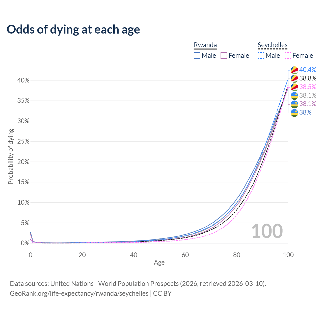 This life expectancy calculator shows the odds of living to 100, 95, 90, and below based on current age for both males and females in Rwanda and the Seychelles, along with mean and median age of death. The calculations are based on the 2026 life tables (actuarial tables) from the UN World Population Prospects.