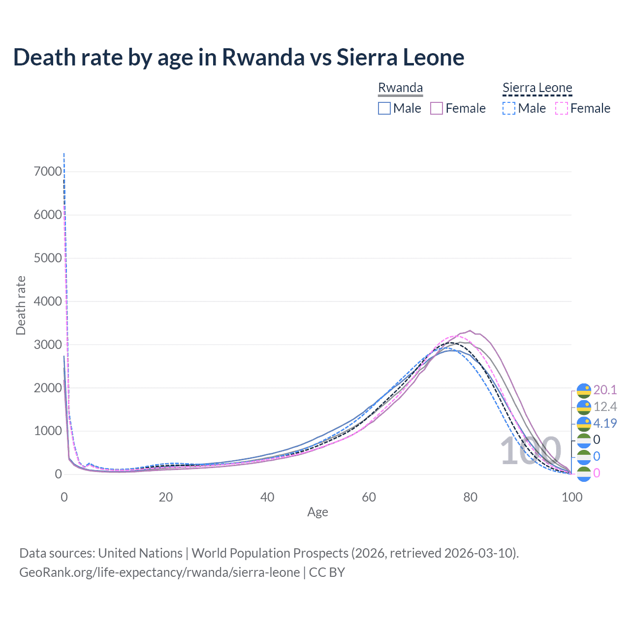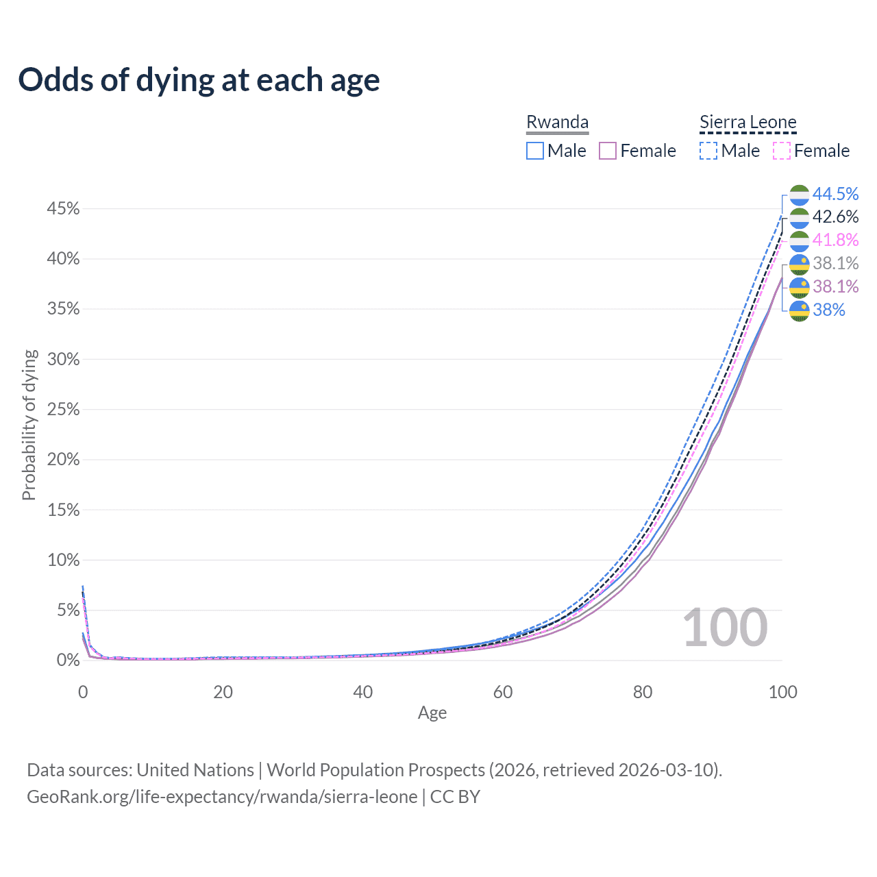 This life expectancy calculator shows the odds of living to 100, 95, 90, and below based on current age for both males and females in Rwanda and Sierra Leone, along with mean and median age of death. The calculations are based on the 2026 life tables (actuarial tables) from the UN World Population Prospects.
