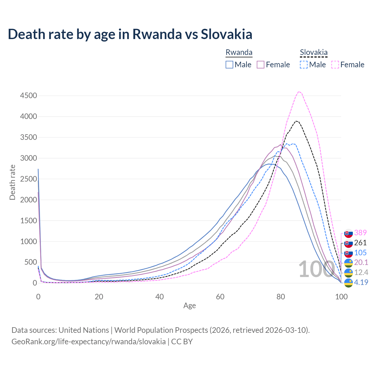 In Rwanda, the most common age of death is 78, compared to 85 in Slovakia. The median age of death is 73.5 in Rwanda and 82 in Slovakia, meaning only half of each cohort is expected to live past that age.