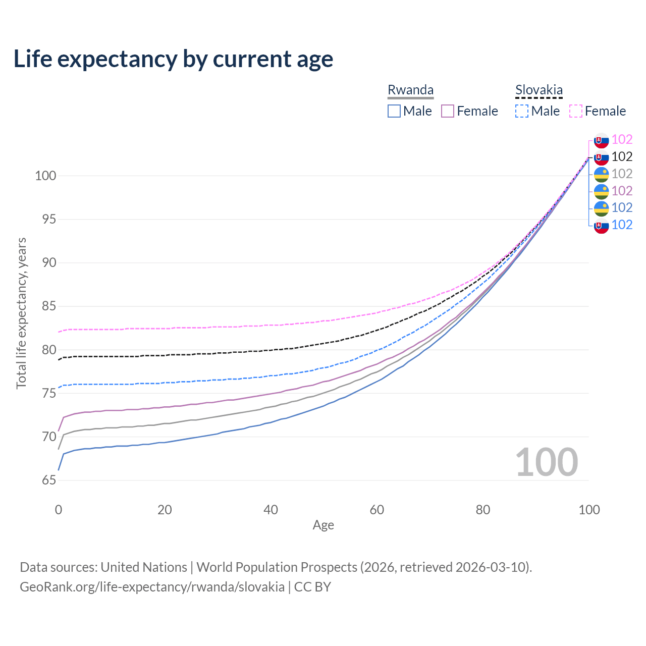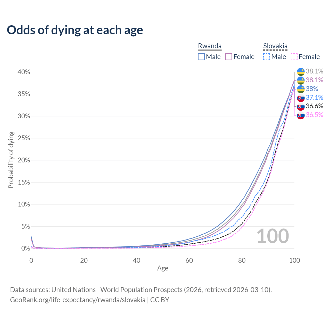 This life expectancy calculator shows the odds of living to 100, 95, 90, and below based on current age for both males and females in Rwanda and Slovakia, along with mean and median age of death. The calculations are based on the 2026 life tables (actuarial tables) from the UN World Population Prospects.