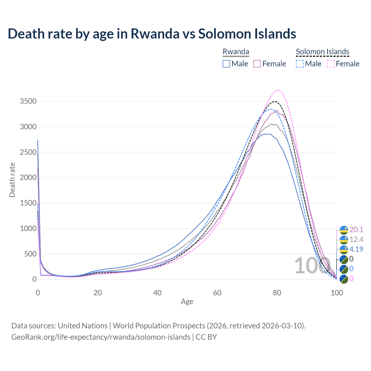 In Rwanda, the most common age of death is 78, compared to 79 in the Solomon Islands. The median age of death is 73.5 in Rwanda and 74.9 in the Solomon Islands, meaning only half of each cohort is expected to live past that age.