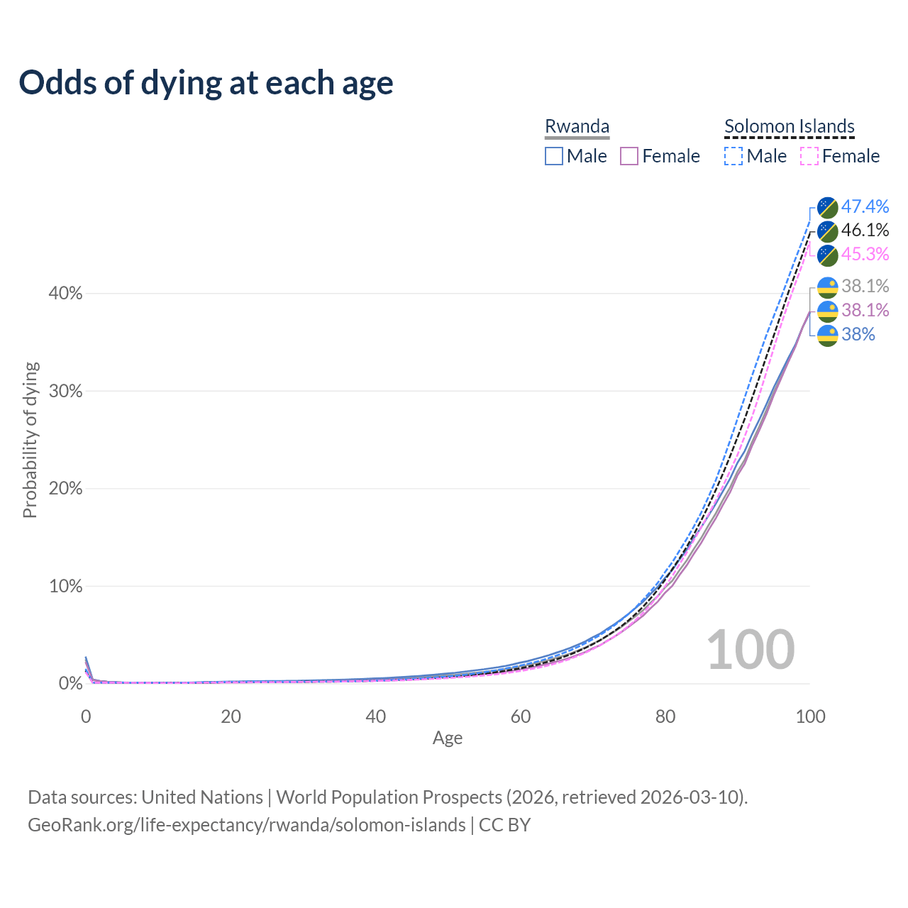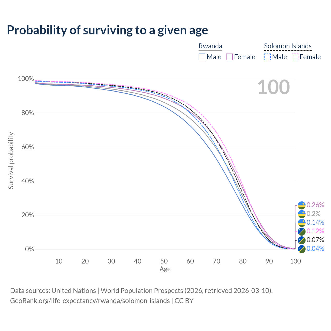 This life expectancy calculator shows the odds of living to 100, 95, 90, and below based on current age for both males and females in Rwanda and the Solomon Islands, along with mean and median age of death. The calculations are based on the 2026 life tables (actuarial tables) from the UN World Population Prospects.