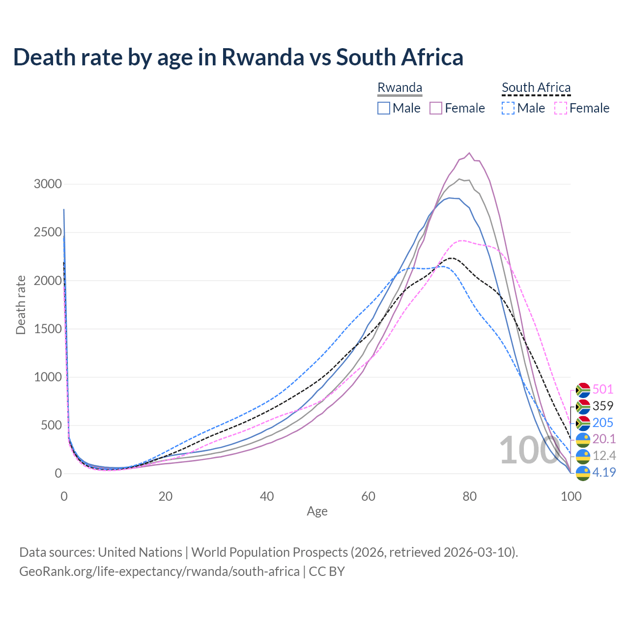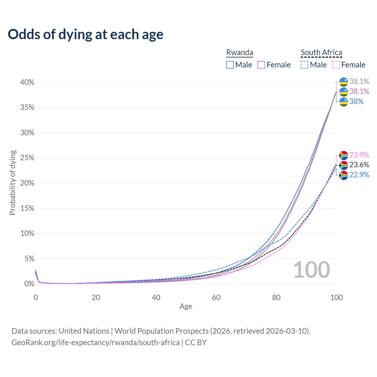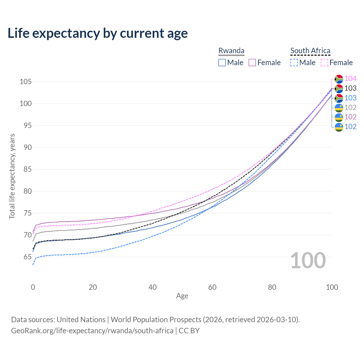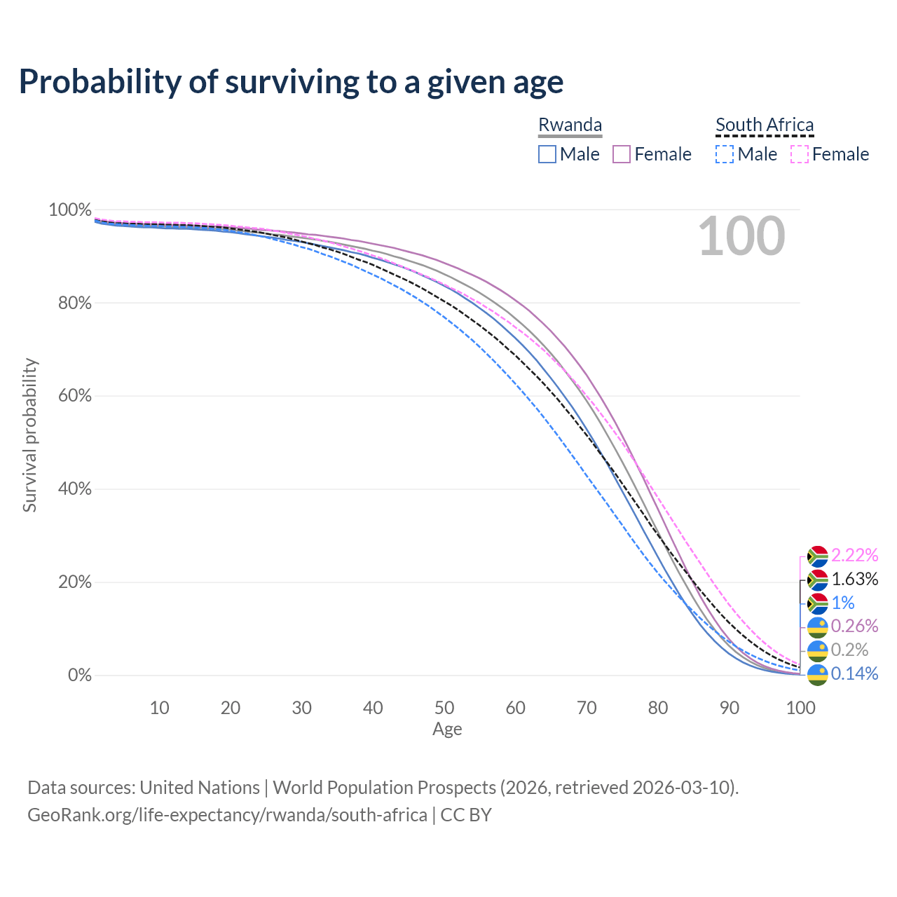 This life expectancy calculator shows the odds of living to 100, 95, 90, and below based on current age for both males and females in Rwanda and South Africa, along with mean and median age of death. The calculations are based on the 2026 life tables (actuarial tables) from the UN World Population Prospects.