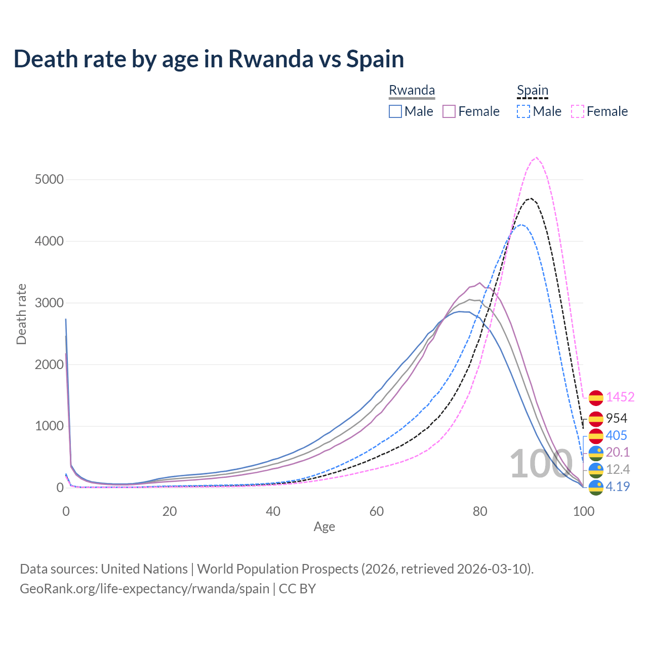 This life expectancy calculator shows the odds of living to 100, 95, 90, and below based on current age for both males and females in Rwanda and Spain, along with mean and median age of death. The calculations are based on the 2026 life tables (actuarial tables) from the UN World Population Prospects.