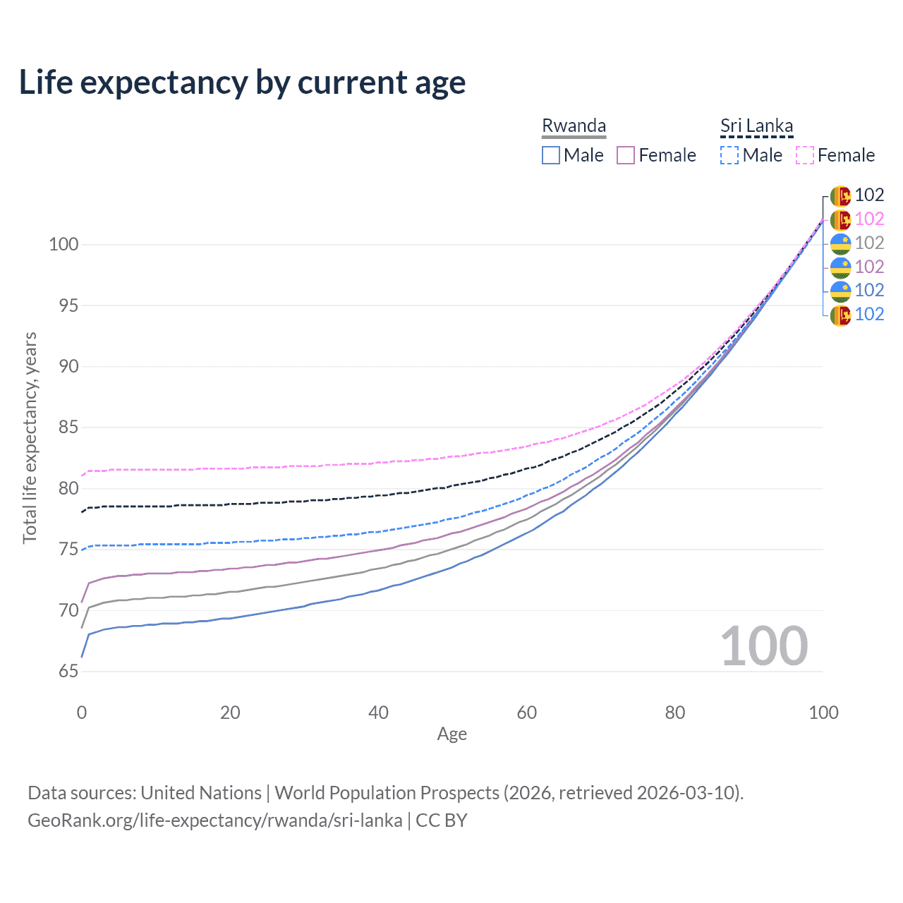 This life expectancy calculator shows the odds of living to 100, 95, 90, and below based on current age for both males and females in Rwanda and Sri Lanka, along with mean and median age of death. The calculations are based on the 2026 life tables (actuarial tables) from the UN World Population Prospects.