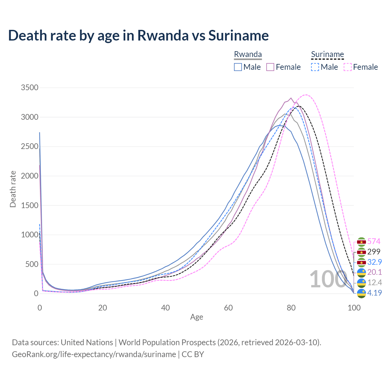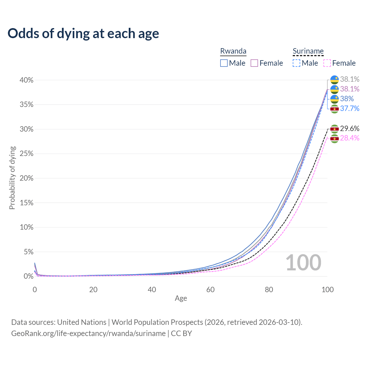 This life expectancy calculator shows the odds of living to 100, 95, 90, and below based on current age for both males and females in Rwanda and Suriname, along with mean and median age of death. The calculations are based on the 2026 life tables (actuarial tables) from the UN World Population Prospects.