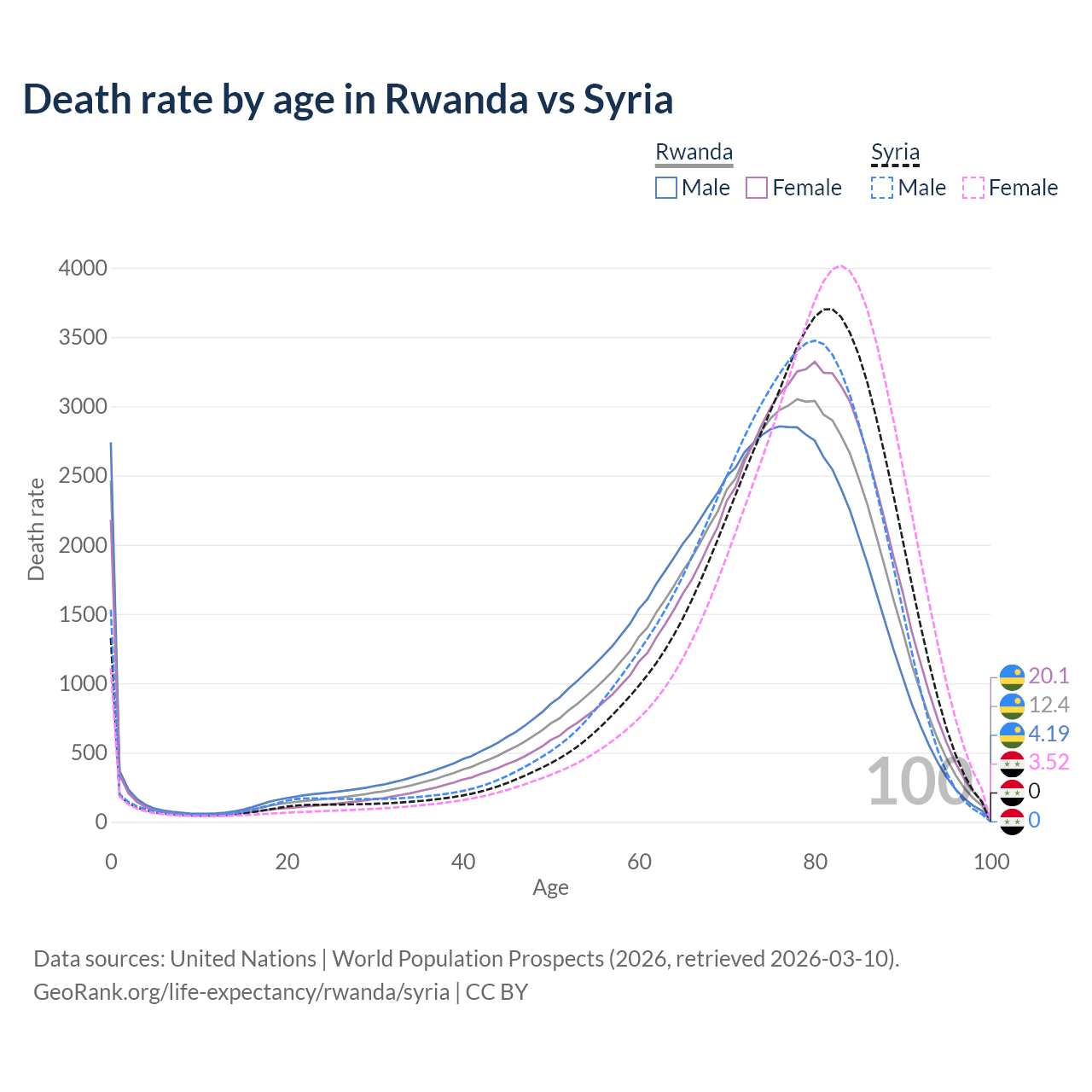 In Rwanda, the most common age of death is 78, compared to 82 in Syria. The median age of death is 73.5 in Rwanda and 77.7 in Syria, meaning only half of each cohort is expected to live past that age.