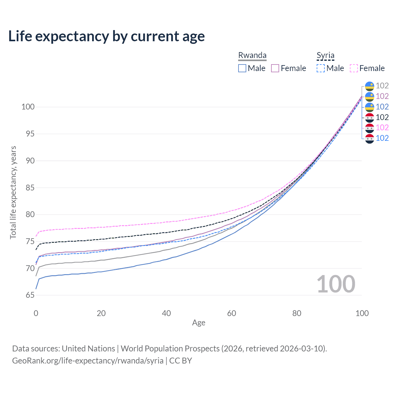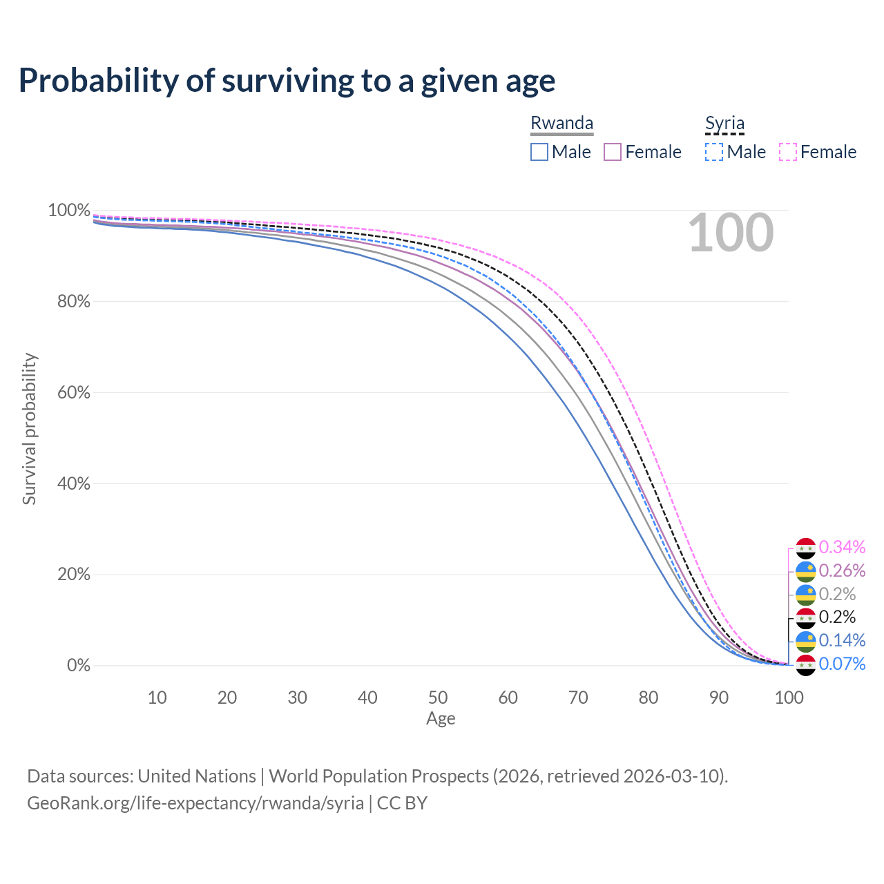 This life expectancy calculator shows the odds of living to 100, 95, 90, and below based on current age for both males and females in Rwanda and Syria, along with mean and median age of death. The calculations are based on the 2026 life tables (actuarial tables) from the UN World Population Prospects.