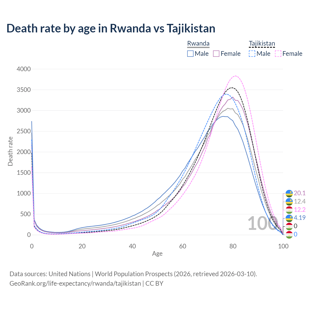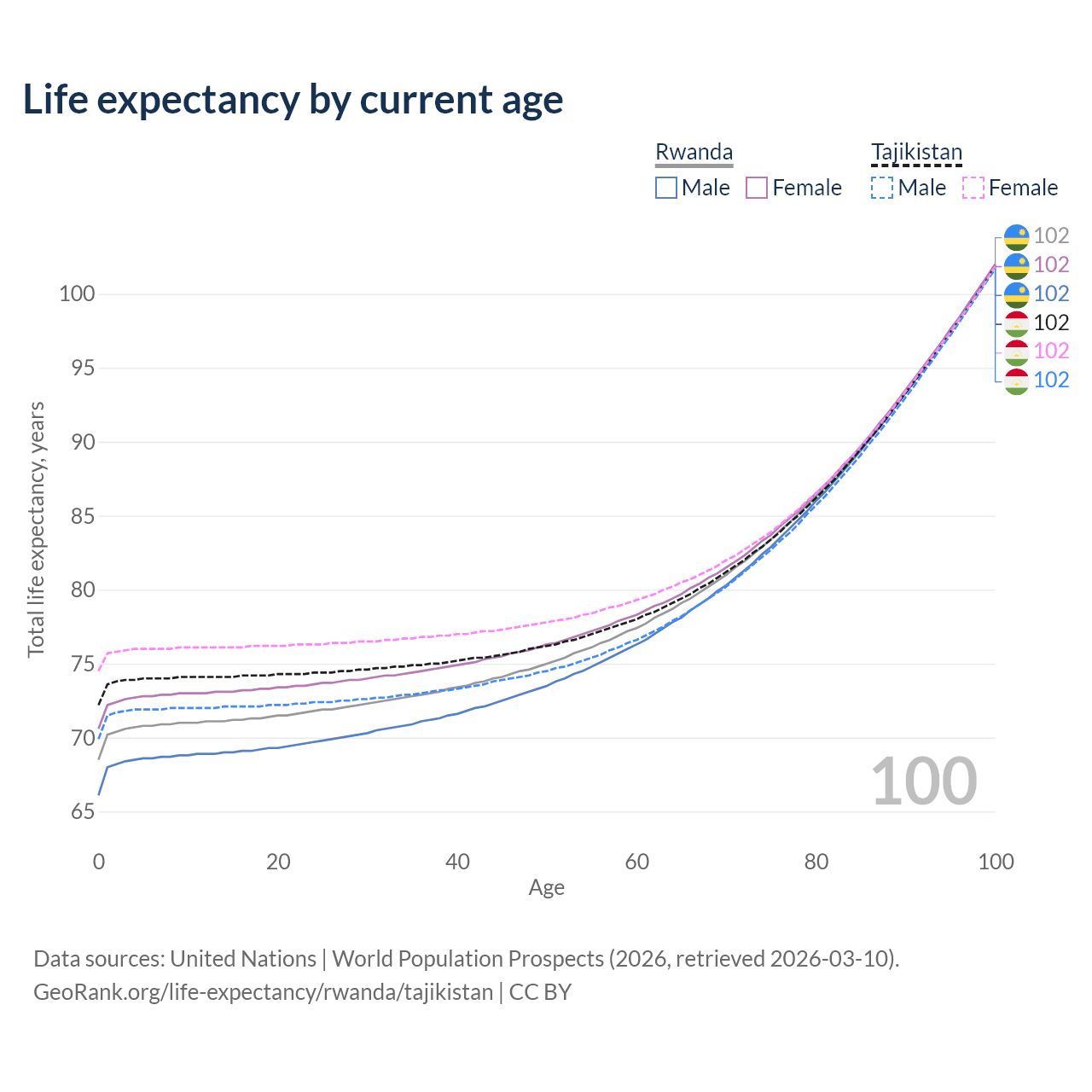 This life expectancy calculator shows the odds of living to 100, 95, 90, and below based on current age for both males and females in Rwanda and Tajikistan, along with mean and median age of death. The calculations are based on the 2026 life tables (actuarial tables) from the UN World Population Prospects.