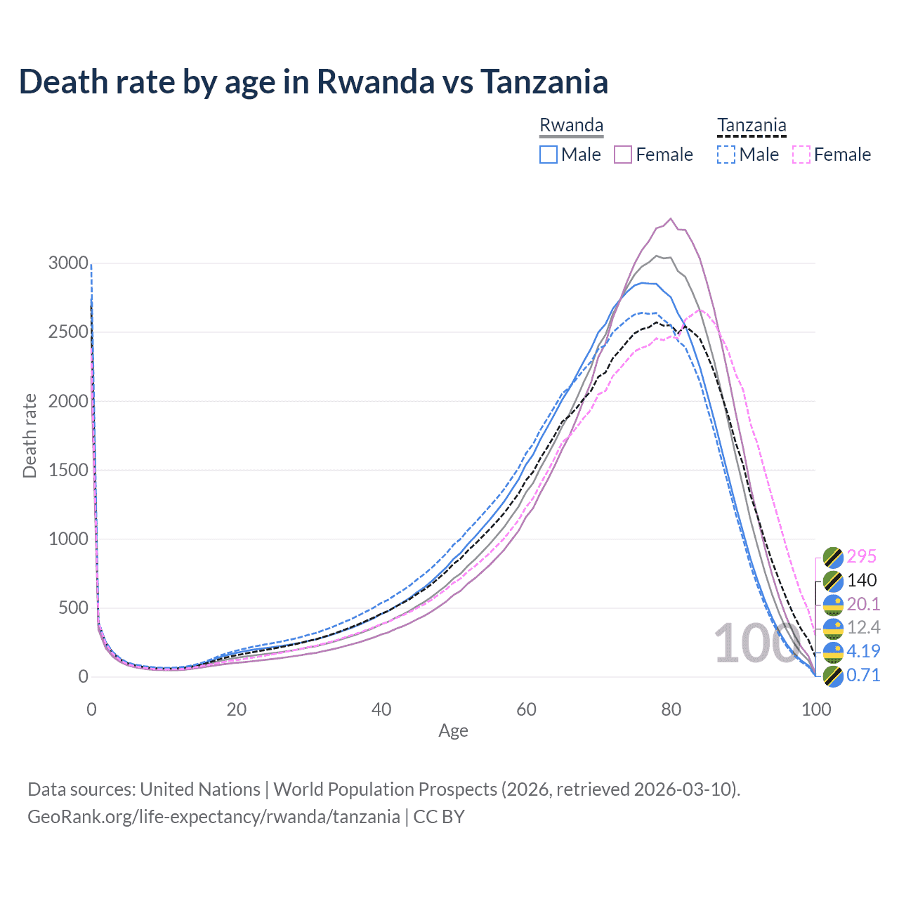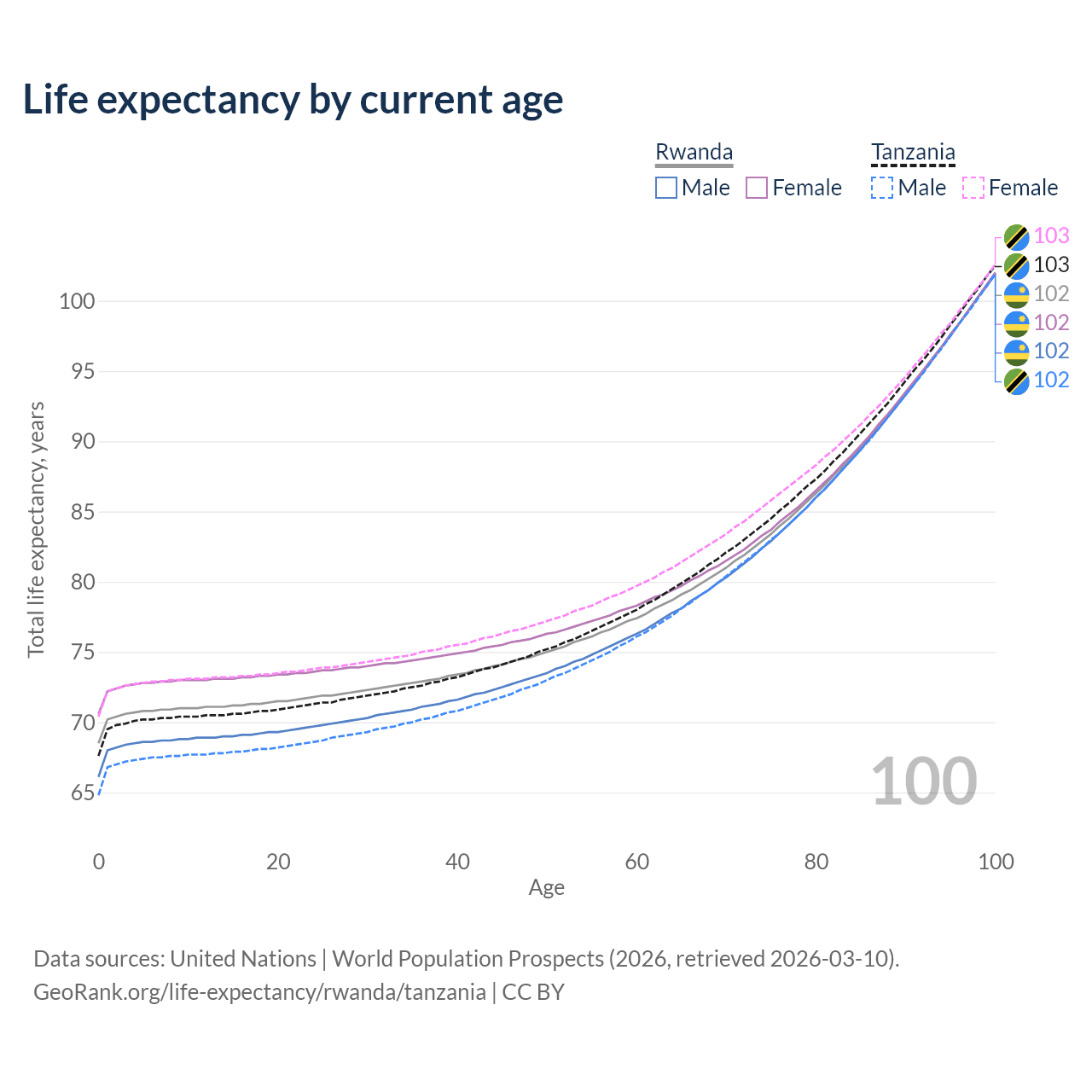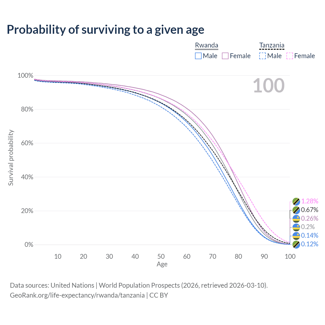This life expectancy calculator shows the odds of living to 100, 95, 90, and below based on current age for both males and females in Rwanda and Tanzania, along with mean and median age of death. The calculations are based on the 2026 life tables (actuarial tables) from the UN World Population Prospects.