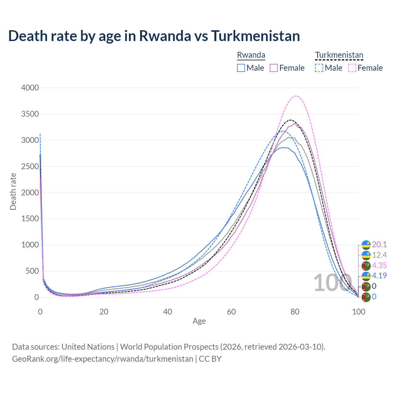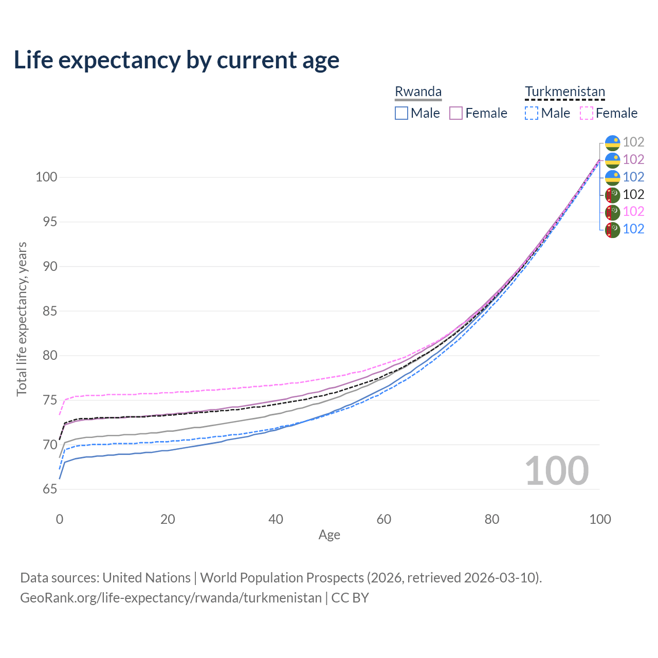 This life expectancy calculator shows the odds of living to 100, 95, 90, and below based on current age for both males and females in Rwanda and Turkmenistan, along with mean and median age of death. The calculations are based on the 2026 life tables (actuarial tables) from the UN World Population Prospects.
