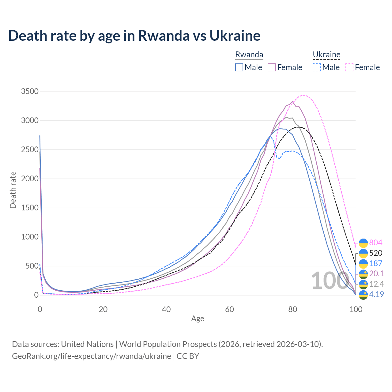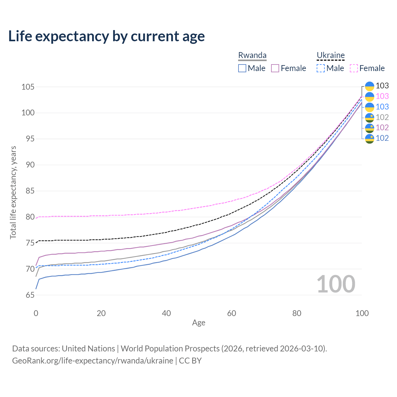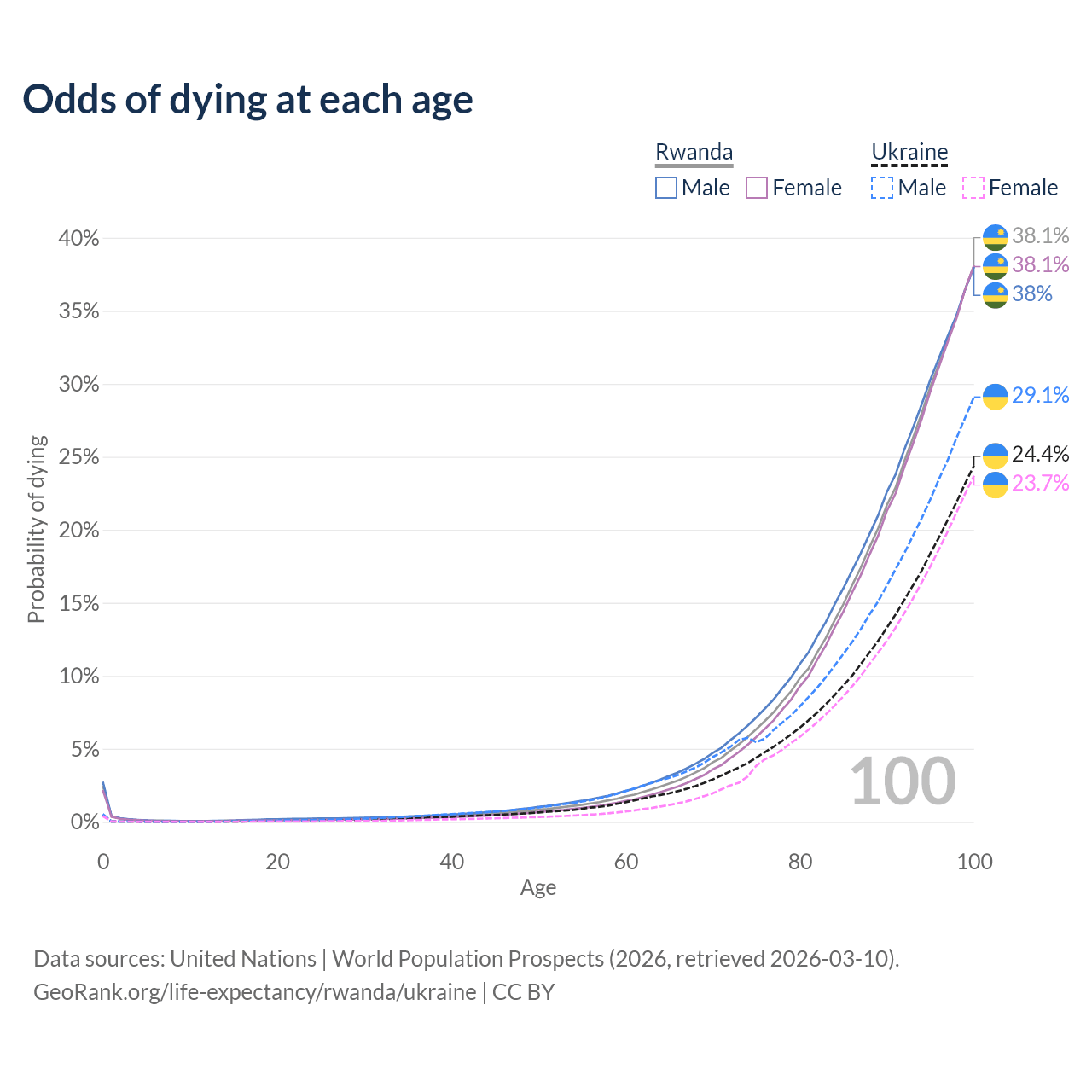 This life expectancy calculator shows the odds of living to 100, 95, 90, and below based on current age for both males and females in Rwanda and Ukraine, along with mean and median age of death. The calculations are based on the 2026 life tables (actuarial tables) from the UN World Population Prospects.