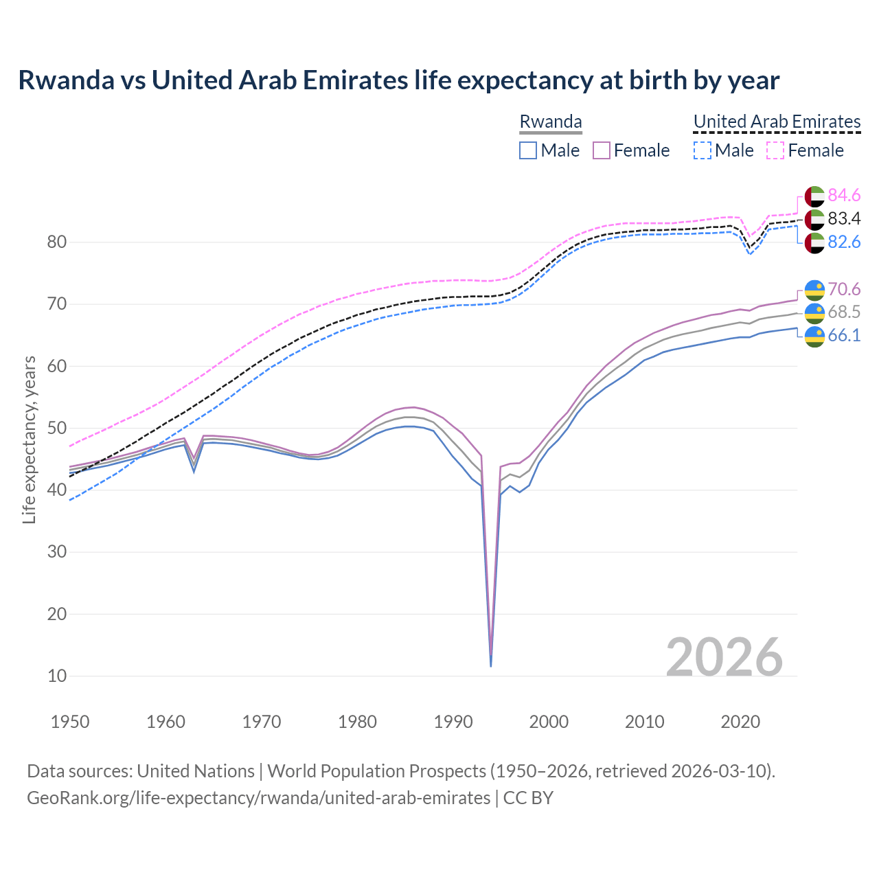 The average life expectancy at birth is 68.5 years in Rwanda vs 83.4 in the United Arab Emirates. Rwanda is ranked 148/197 by life expectancy, and the United Arab Emirates is 17/197. In Rwanda, the life expectancy is 66.1 years for males and 70.6 years for females. In the United Arab Emirates, it's 82.6 years for males and 84.6 years for females.