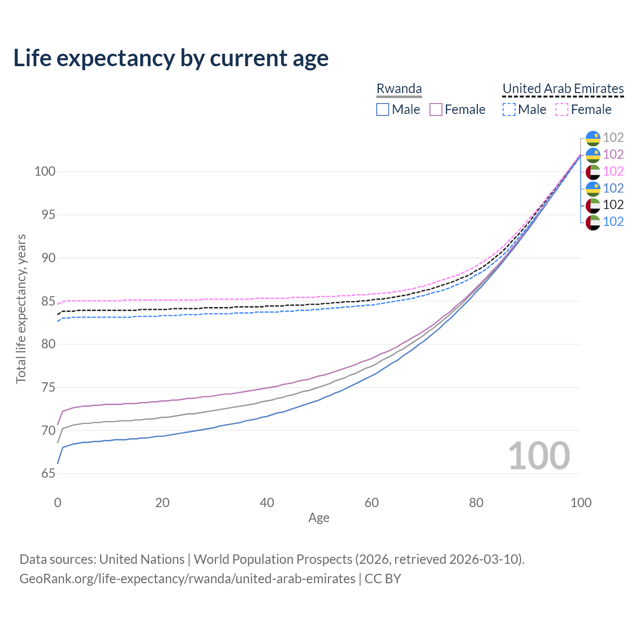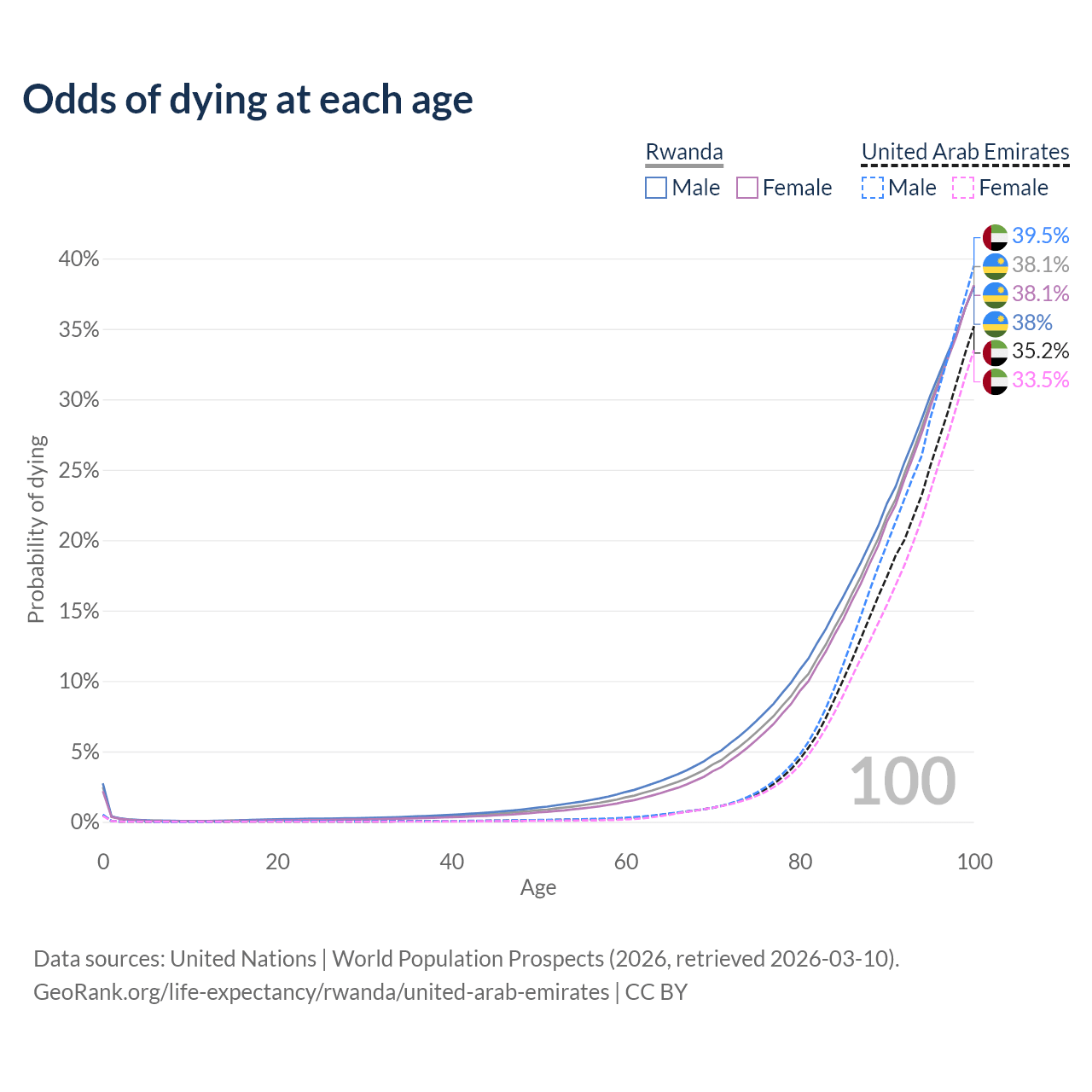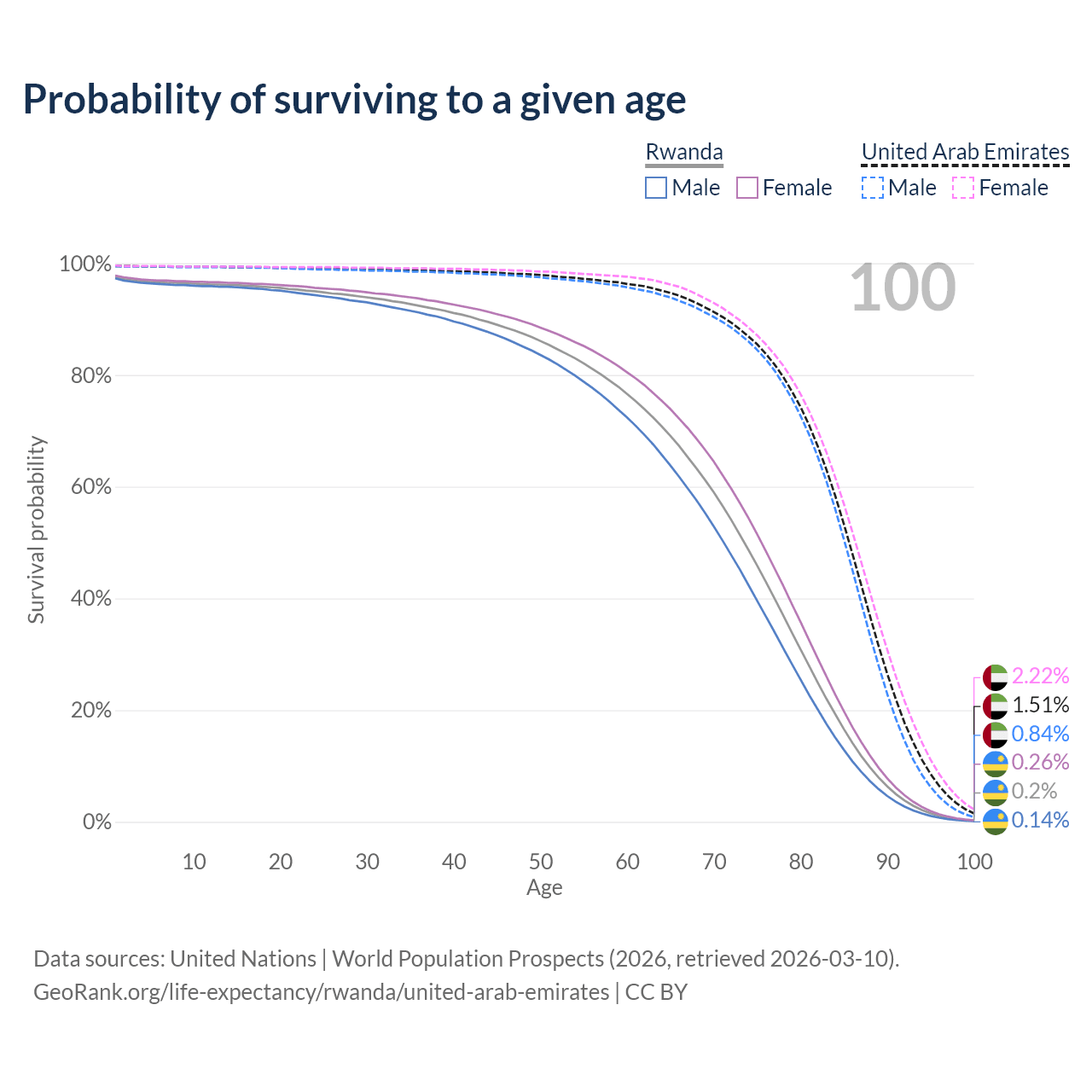 This life expectancy calculator shows the odds of living to 100, 95, 90, and below based on current age for both males and females in Rwanda and the United Arab Emirates, along with mean and median age of death. The calculations are based on the 2026 life tables (actuarial tables) from the UN World Population Prospects.