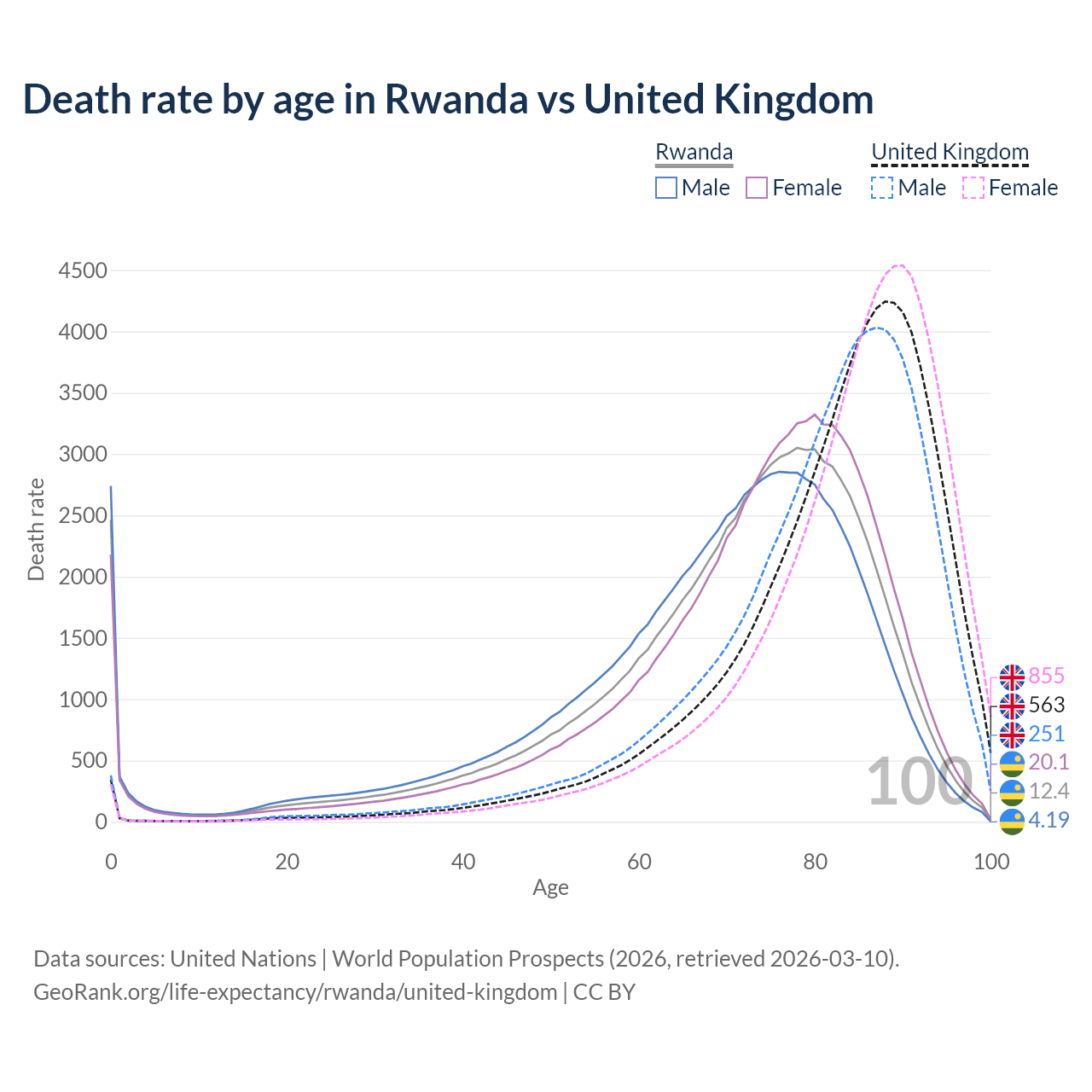 In Rwanda, the most common age of death is 78, compared to 88 in the United Kingdom. The median age of death is 73.5 in Rwanda and 84.9 in the United Kingdom, meaning only half of each cohort is expected to live past that age.