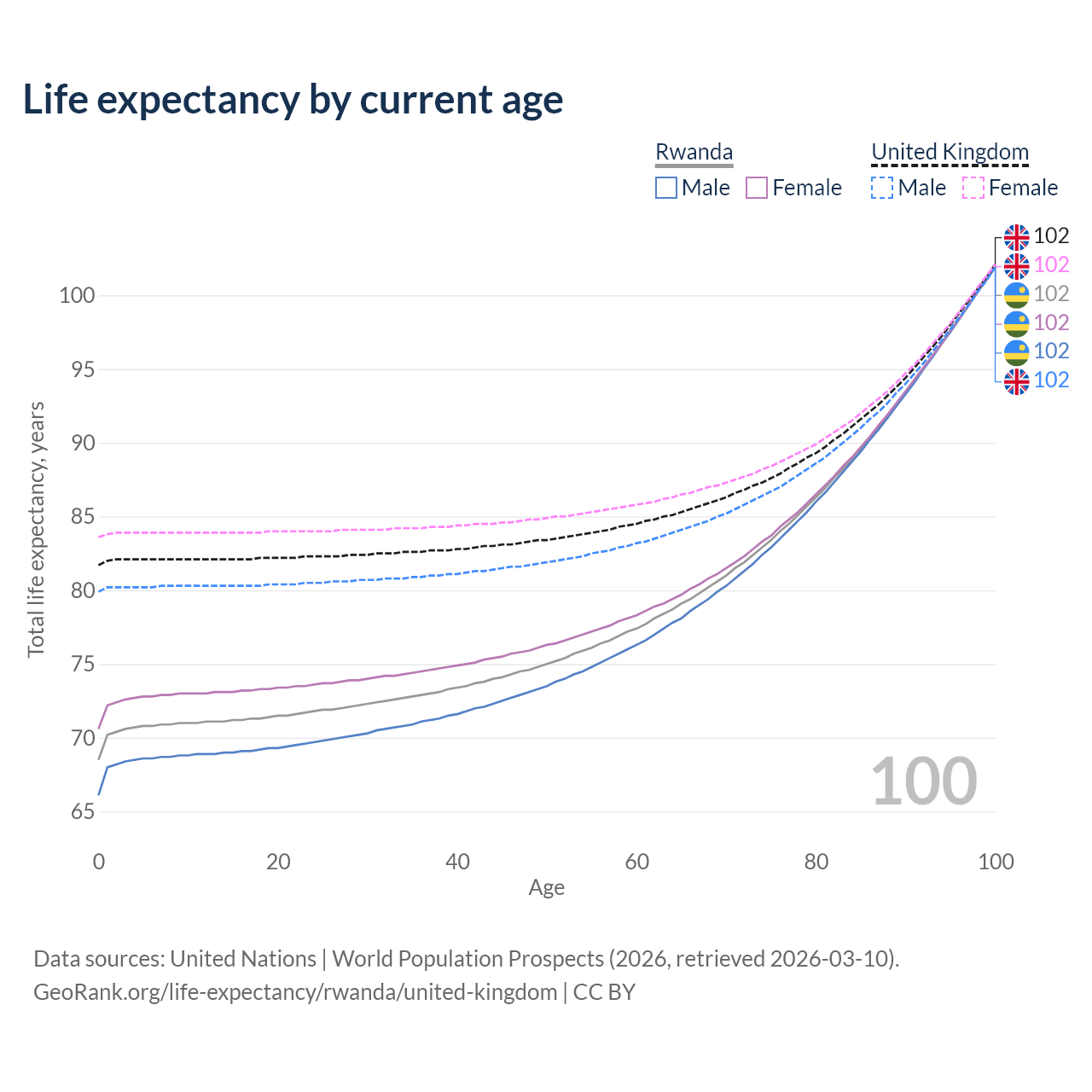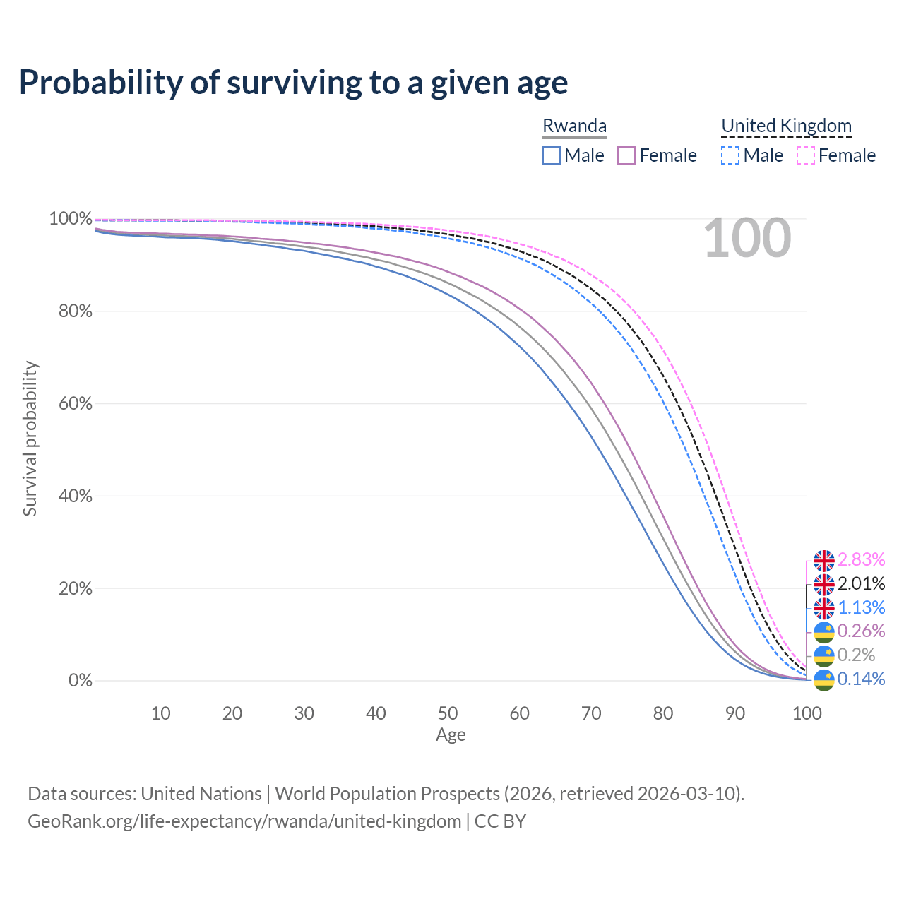 This life expectancy calculator shows the odds of living to 100, 95, 90, and below based on current age for both males and females in Rwanda and the United Kingdom, along with mean and median age of death. The calculations are based on the 2026 life tables (actuarial tables) from the UN World Population Prospects.
