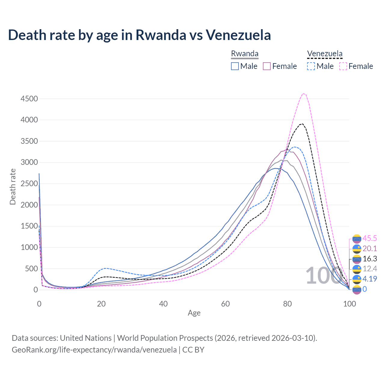In Rwanda, the most common age of death is 78, compared to 85 in Venezuela. The median age of death is 73.5 in Rwanda and 79 in Venezuela, meaning only half of each cohort is expected to live past that age.