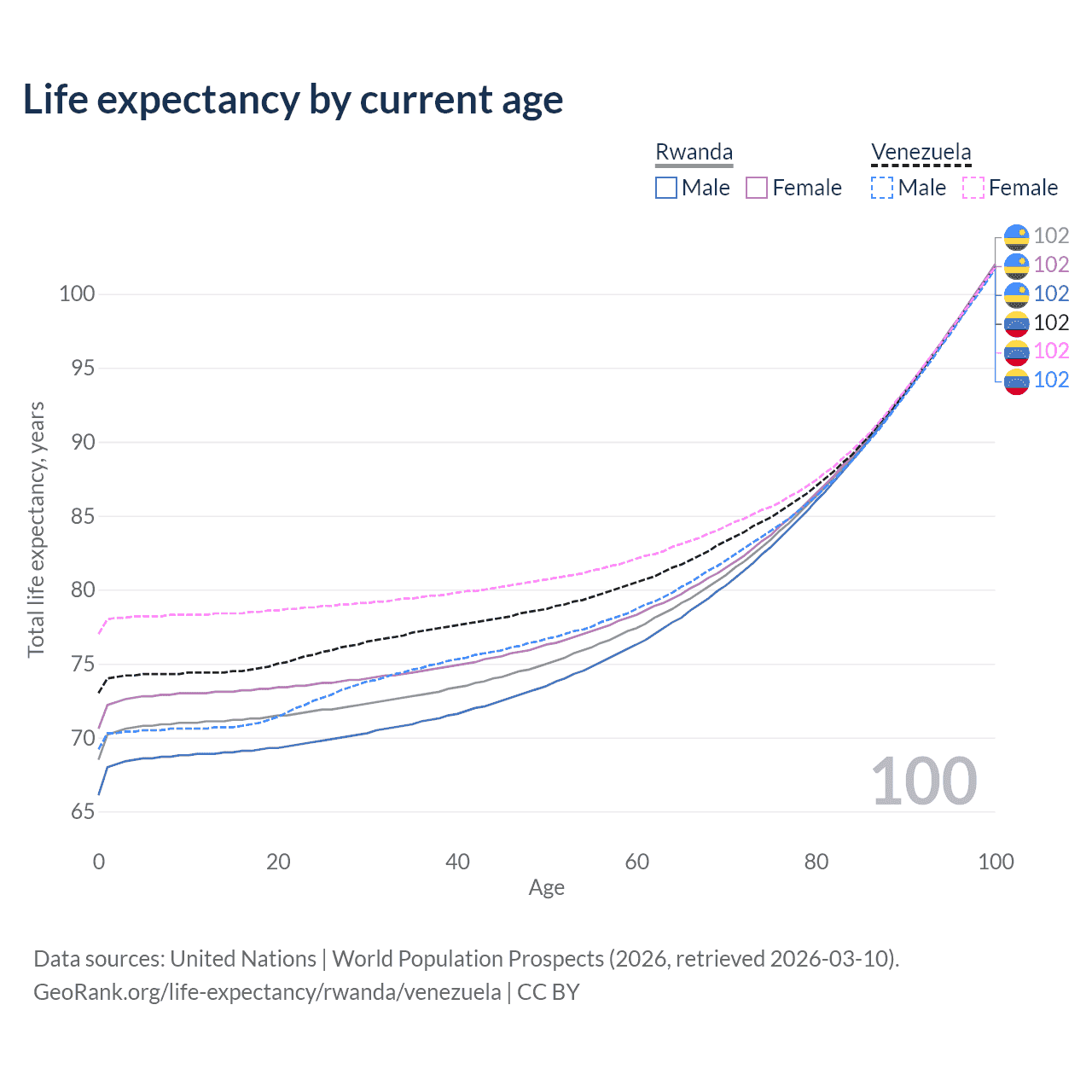 This life expectancy calculator shows the odds of living to 100, 95, 90, and below based on current age for both males and females in Rwanda and Venezuela, along with mean and median age of death. The calculations are based on the 2026 life tables (actuarial tables) from the UN World Population Prospects.