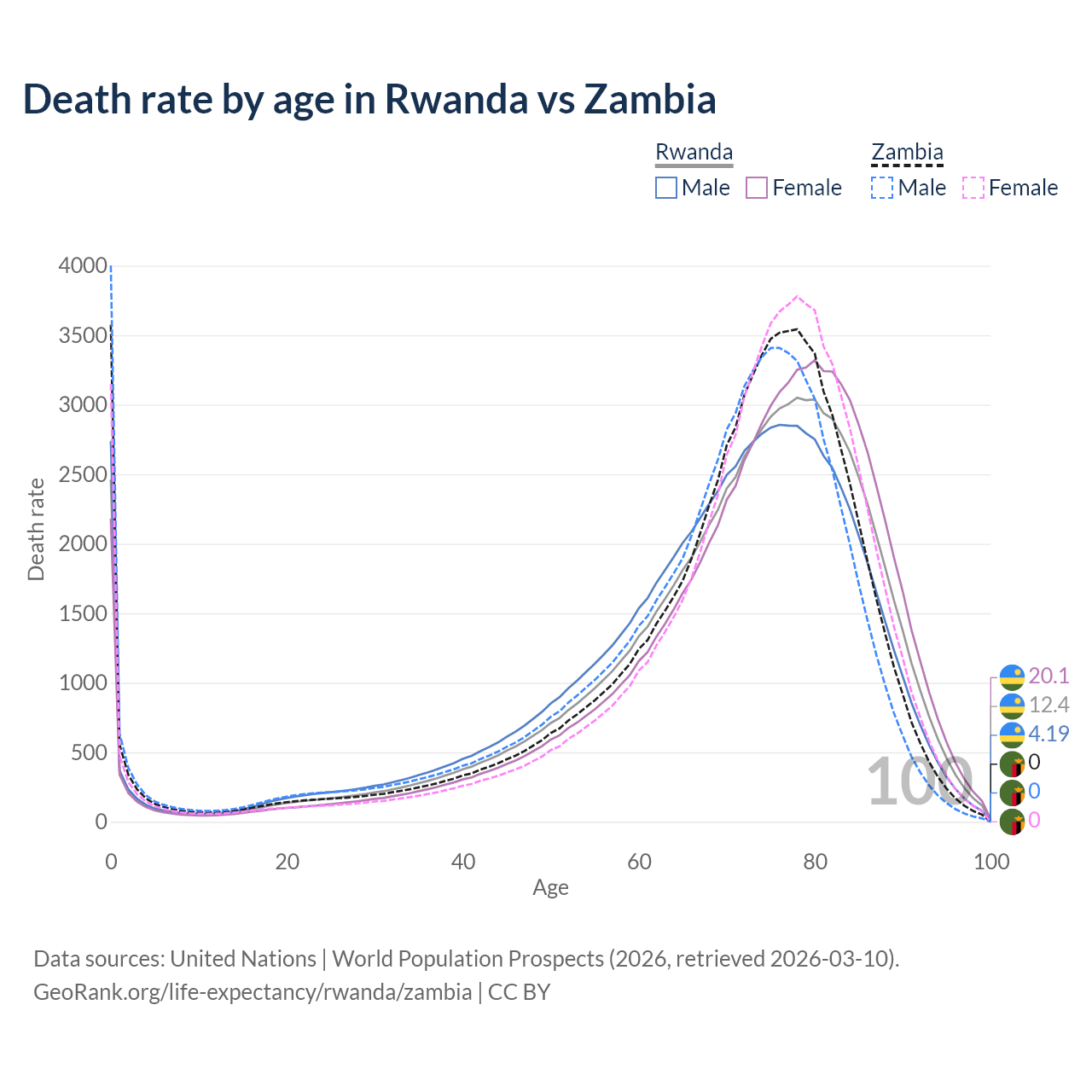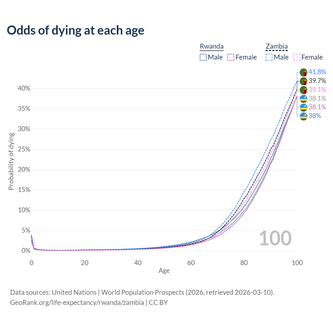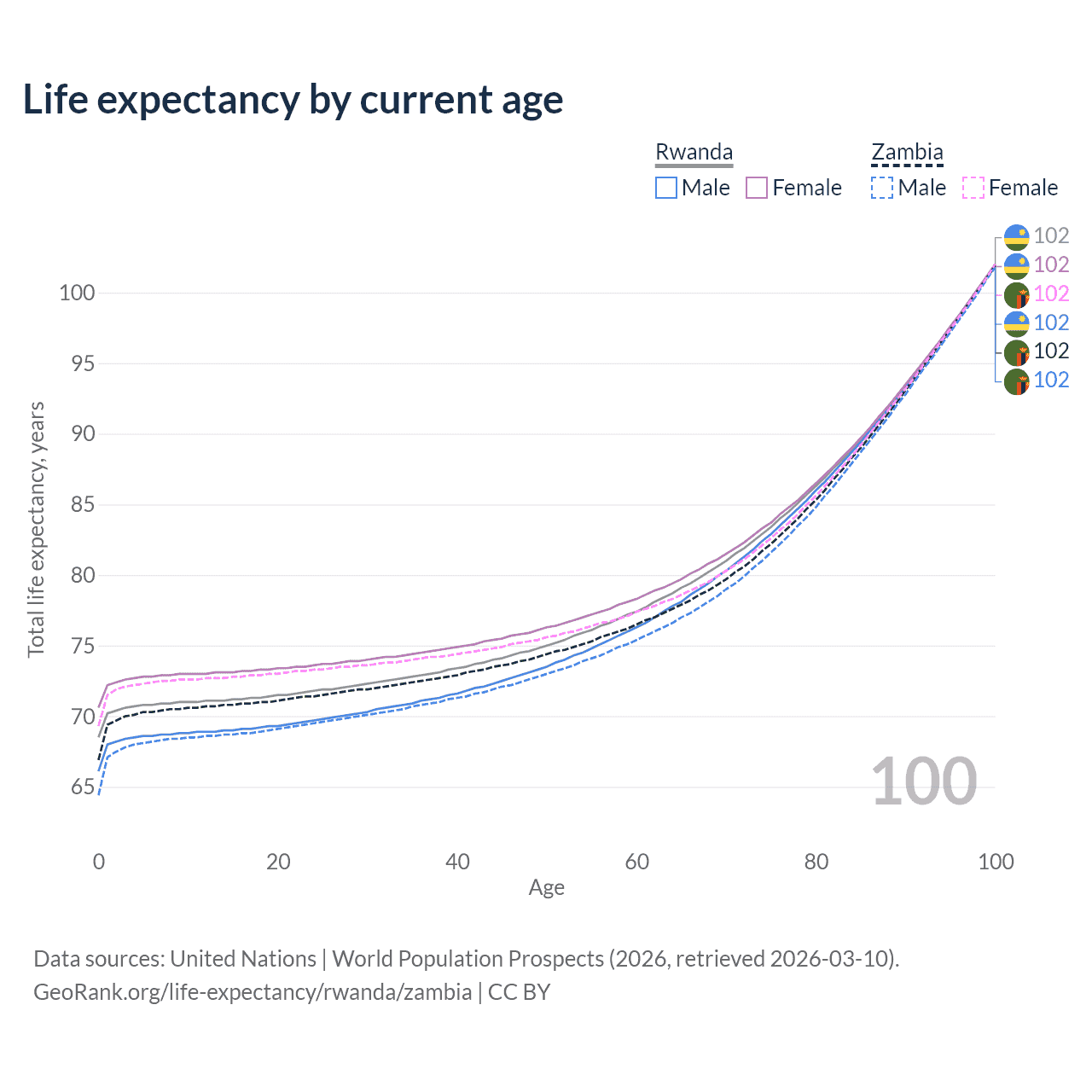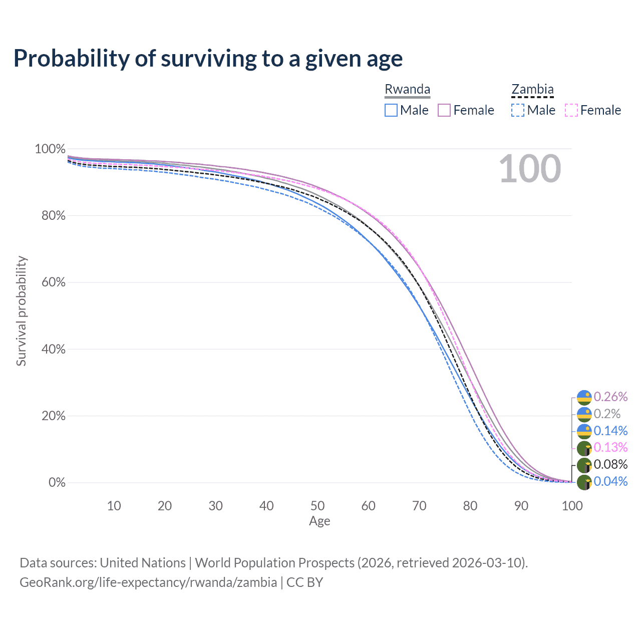 This life expectancy calculator shows the odds of living to 100, 95, 90, and below based on current age for both males and females in Rwanda and Zambia, along with mean and median age of death. The calculations are based on the 2026 life tables (actuarial tables) from the UN World Population Prospects.