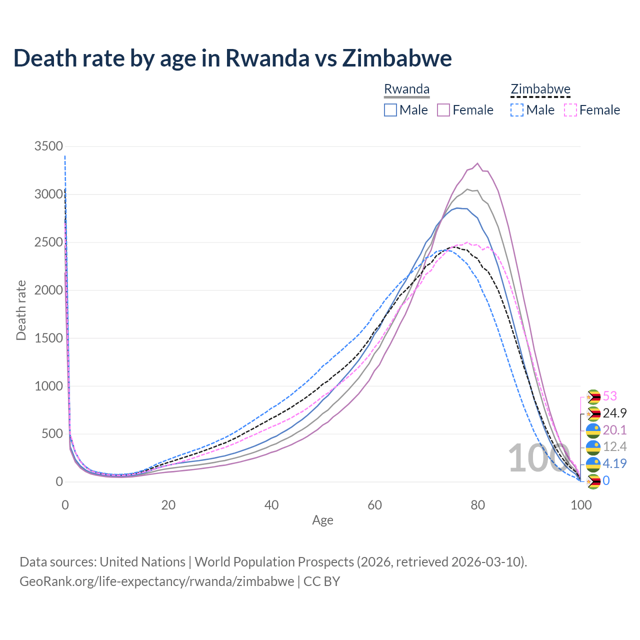 In Rwanda, the most common age of death is 78, compared to 0 in Zimbabwe. The median age of death is 73.5 in Rwanda and 68.8 in Zimbabwe, meaning only half of each cohort is expected to live past that age.