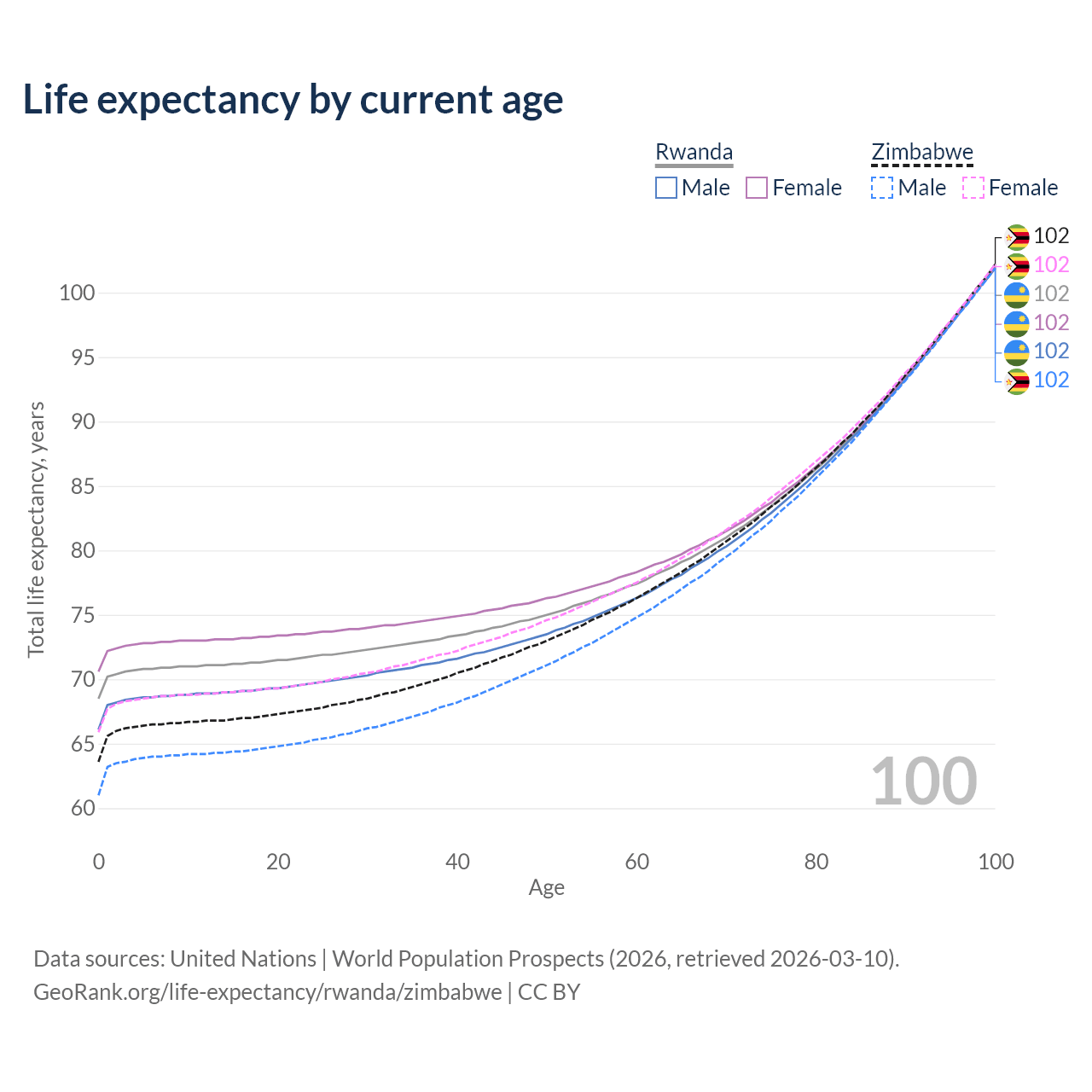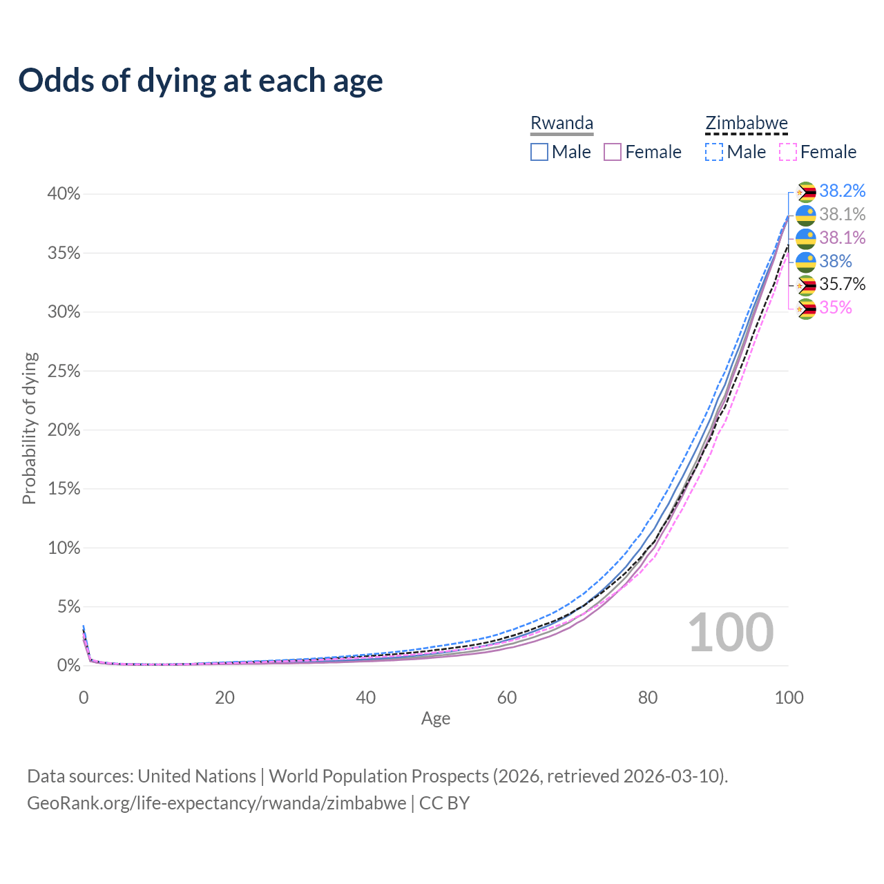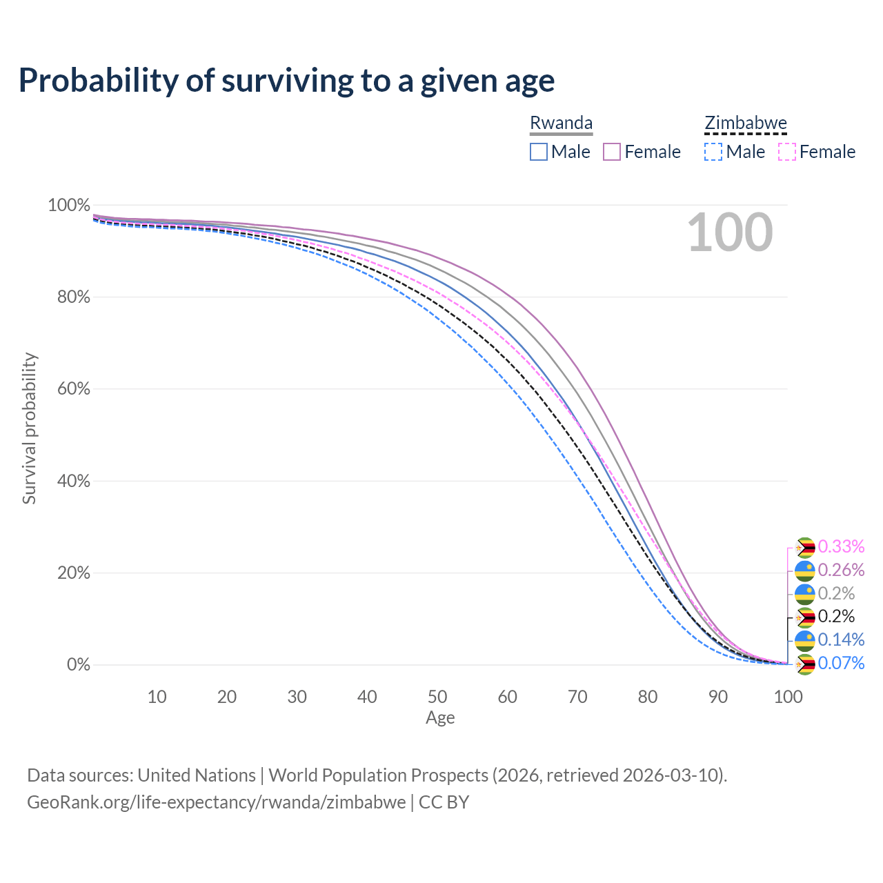 This life expectancy calculator shows the odds of living to 100, 95, 90, and below based on current age for both males and females in Rwanda and Zimbabwe, along with mean and median age of death. The calculations are based on the 2026 life tables (actuarial tables) from the UN World Population Prospects.