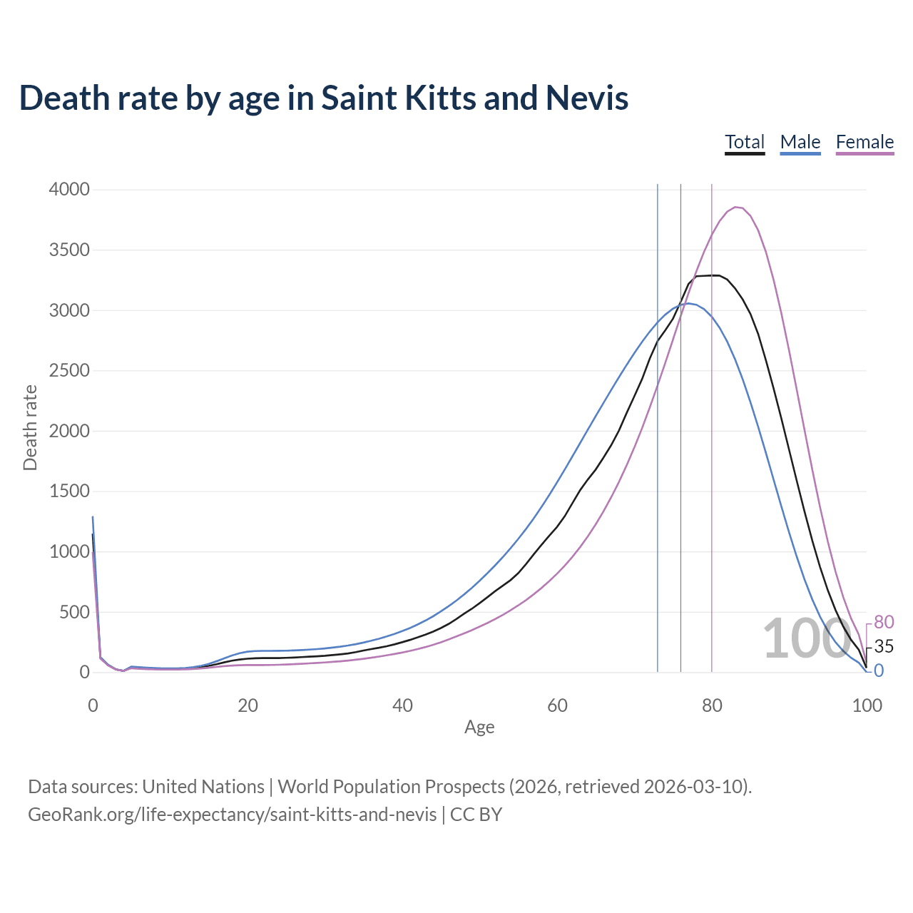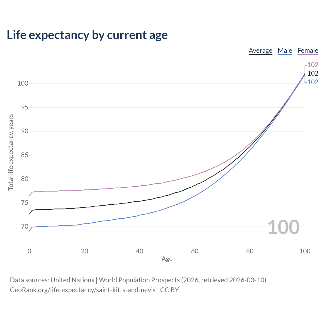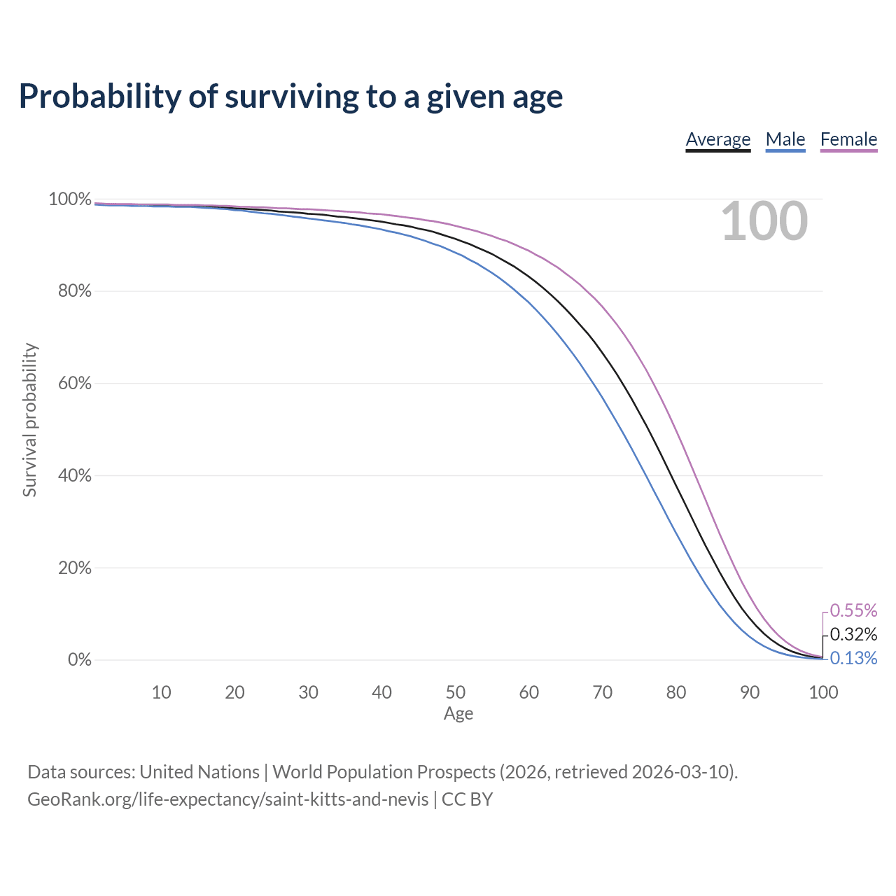 This life expectancy calculator shows the odds of living to 100, 95, 90, and below based on current age for both males and females in Saint Kitts and Nevis, along with mean and median age of death. The calculations are based on the 2026 life tables (actuarial tables) from the UN World Population Prospects.