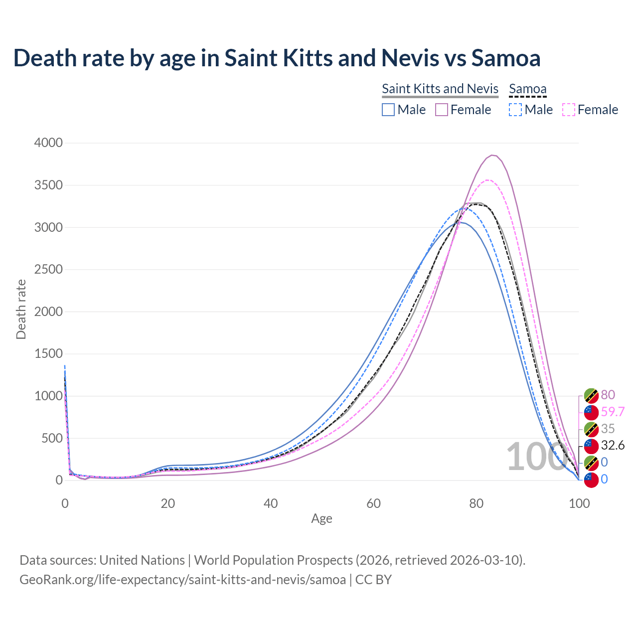 In Saint Kitts and Nevis, the most common age of death is 80, compared to 80 in Samoa. The median age of death is 76.3 in Saint Kitts and Nevis and 75.9 in Samoa, meaning only half of each cohort is expected to live past that age.