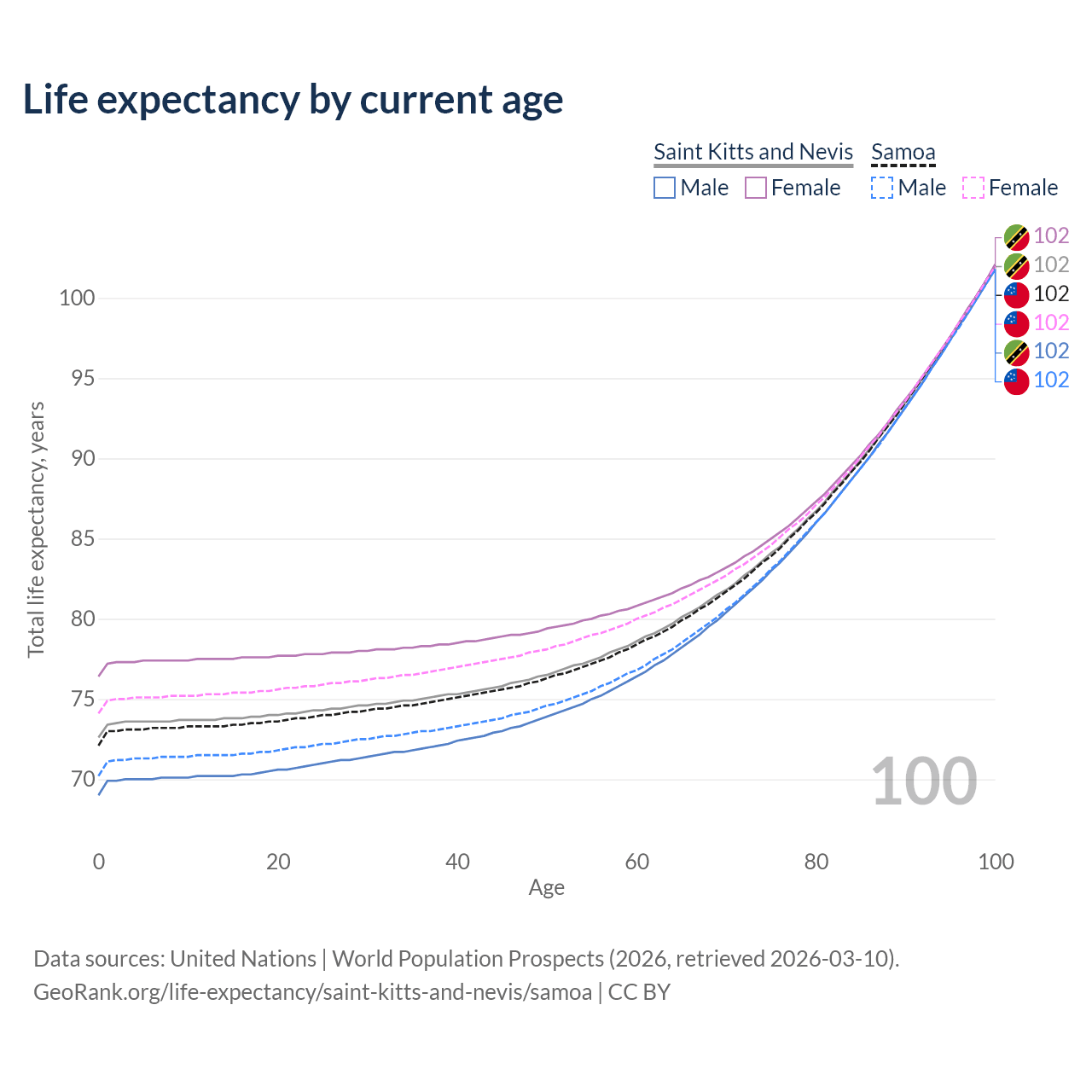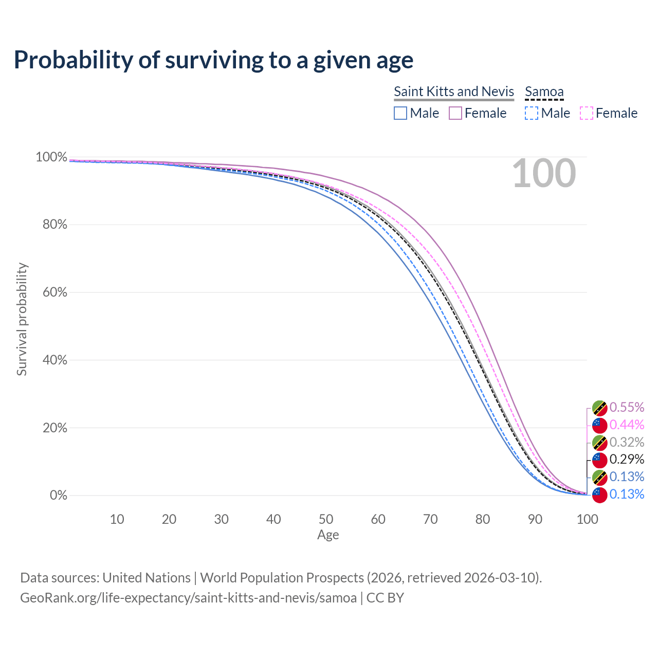 This life expectancy calculator shows the odds of living to 100, 95, 90, and below based on current age for both males and females in Saint Kitts and Nevis and Samoa, along with mean and median age of death. The calculations are based on the 2026 life tables (actuarial tables) from the UN World Population Prospects.