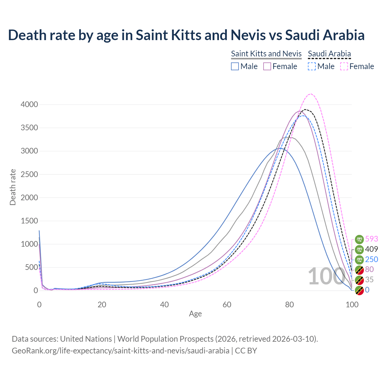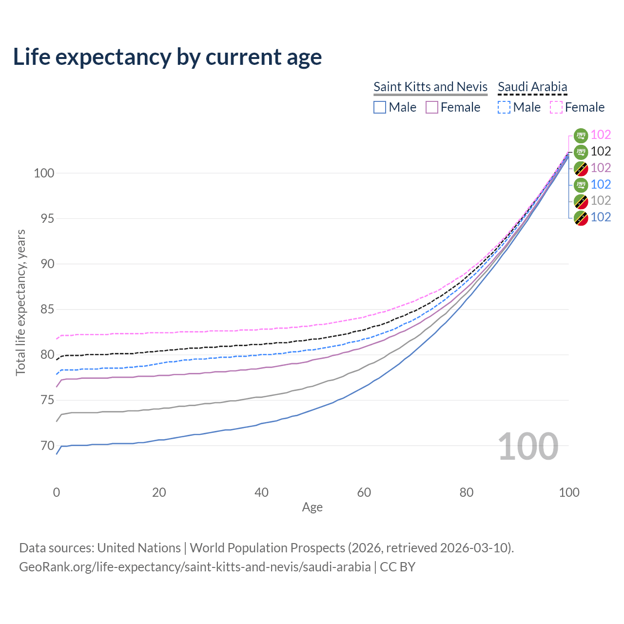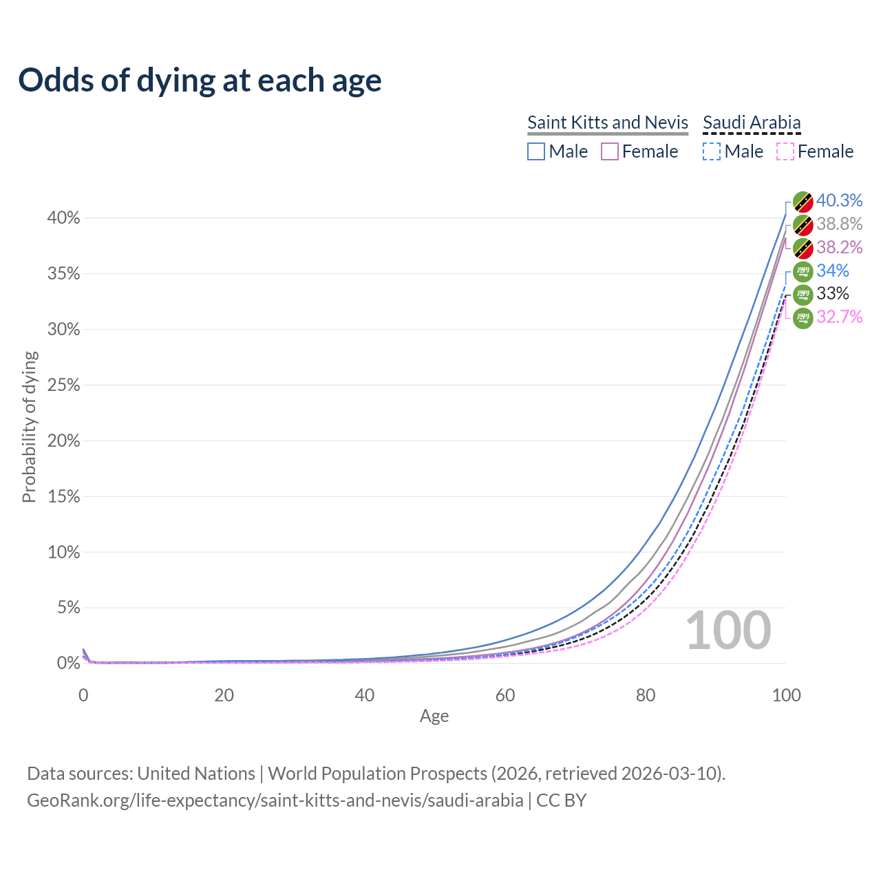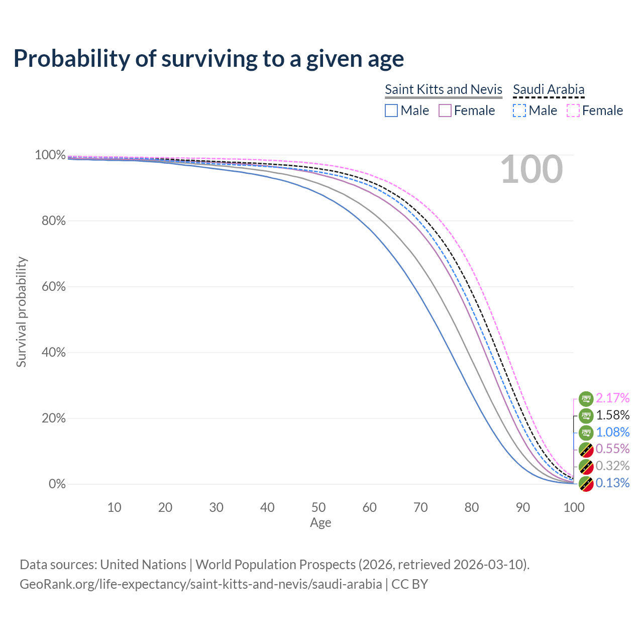 This life expectancy calculator shows the odds of living to 100, 95, 90, and below based on current age for both males and females in Saint Kitts and Nevis and Saudi Arabia, along with mean and median age of death. The calculations are based on the 2026 life tables (actuarial tables) from the UN World Population Prospects.