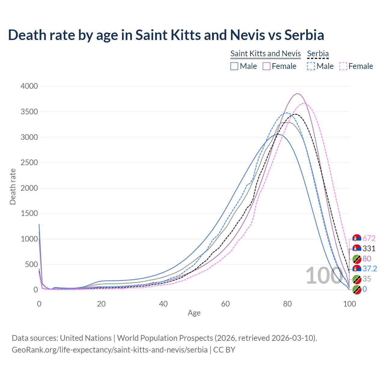 In Saint Kitts and Nevis, the most common age of death is 80, compared to 83 in Serbia. The median age of death is 76.3 in Saint Kitts and Nevis and 79.6 in Serbia, meaning only half of each cohort is expected to live past that age.
