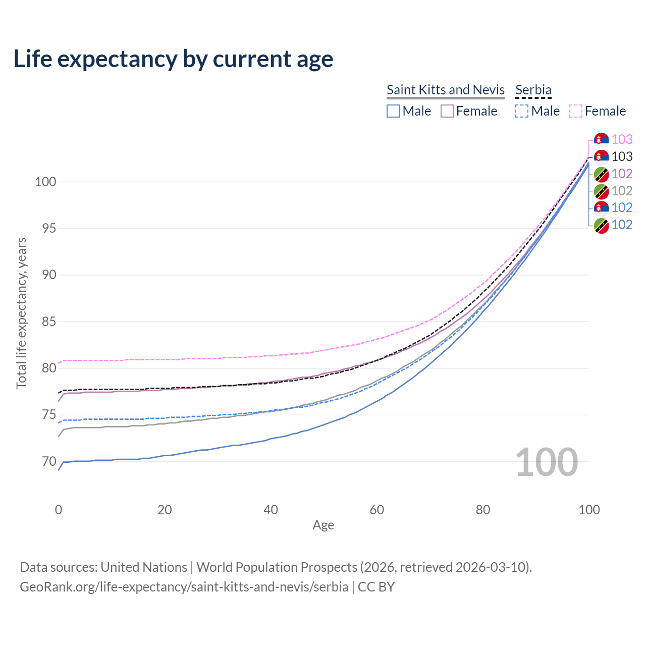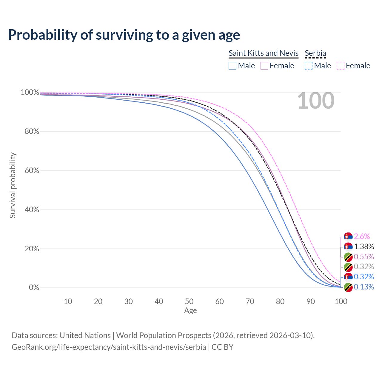 This life expectancy calculator shows the odds of living to 100, 95, 90, and below based on current age for both males and females in Saint Kitts and Nevis and Serbia, along with mean and median age of death. The calculations are based on the 2026 life tables (actuarial tables) from the UN World Population Prospects.