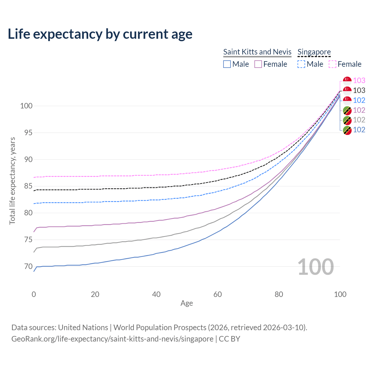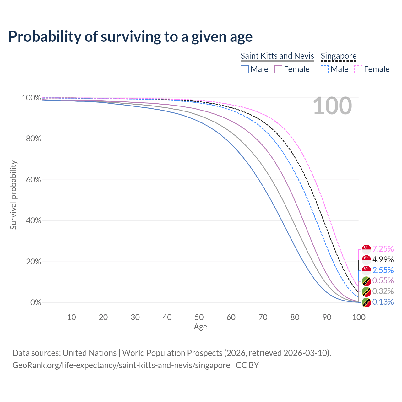 This life expectancy calculator shows the odds of living to 100, 95, 90, and below based on current age for both males and females in Saint Kitts and Nevis and Singapore, along with mean and median age of death. The calculations are based on the 2026 life tables (actuarial tables) from the UN World Population Prospects.