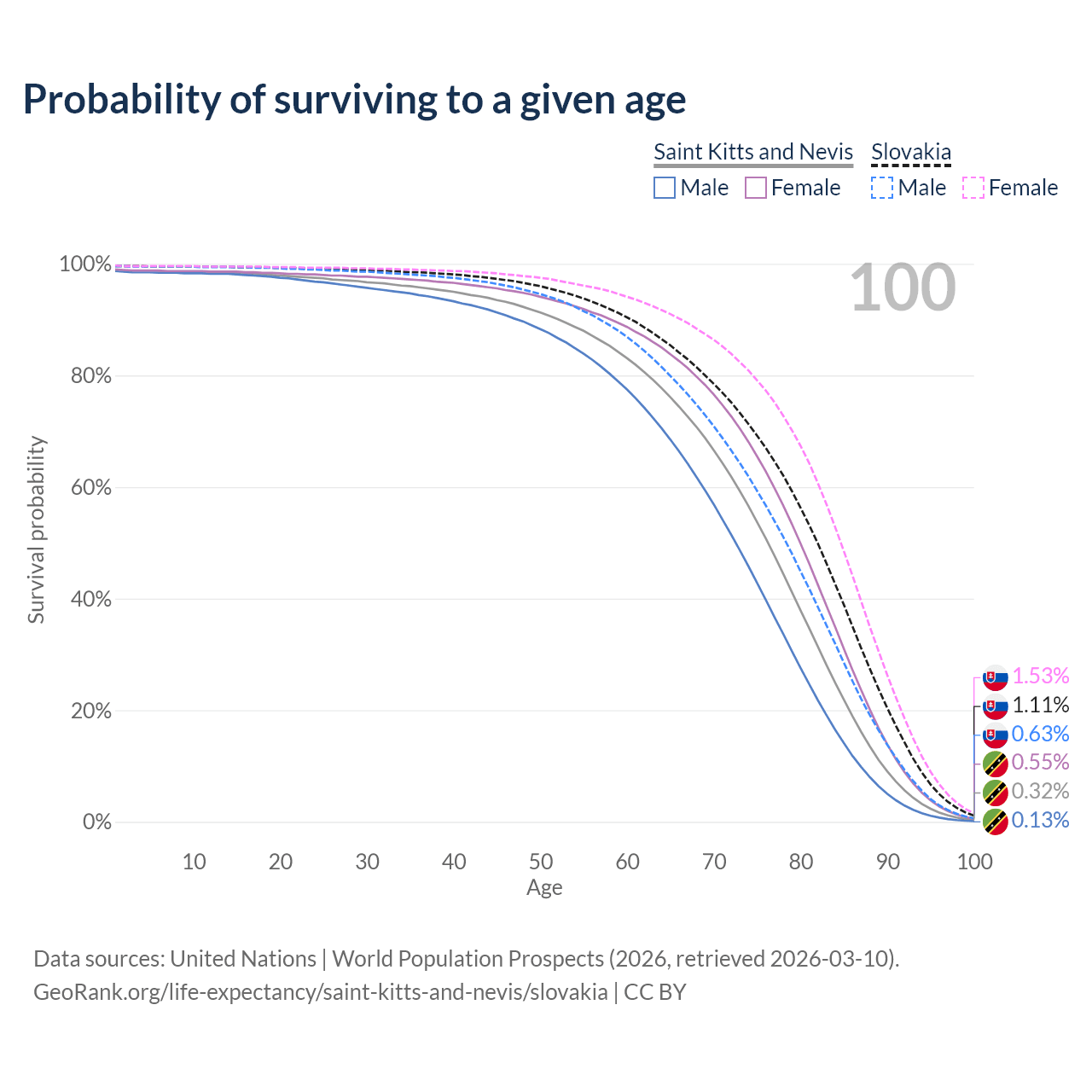 This life expectancy calculator shows the odds of living to 100, 95, 90, and below based on current age for both males and females in Saint Kitts and Nevis and Slovakia, along with mean and median age of death. The calculations are based on the 2026 life tables (actuarial tables) from the UN World Population Prospects.