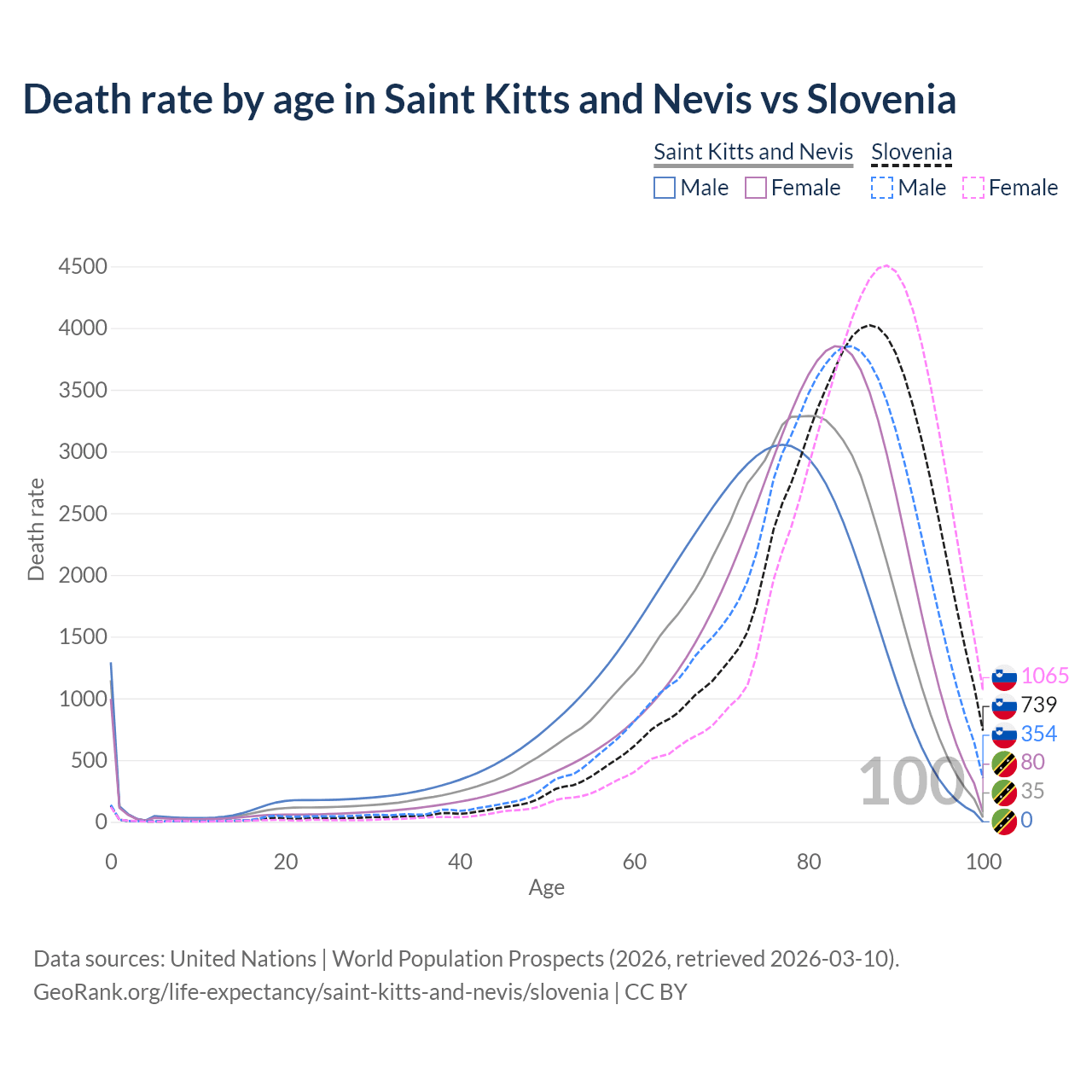 In Saint Kitts and Nevis, the most common age of death is 80, compared to 87 in Slovenia. The median age of death is 76.3 in Saint Kitts and Nevis and 84.4 in Slovenia, meaning only half of each cohort is expected to live past that age.