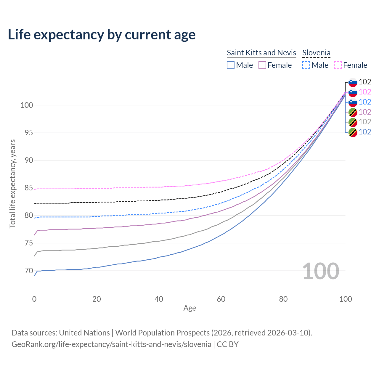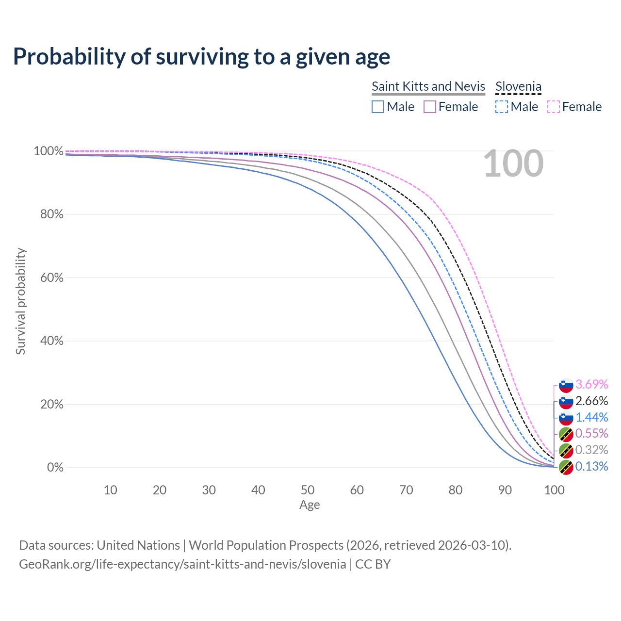 This life expectancy calculator shows the odds of living to 100, 95, 90, and below based on current age for both males and females in Saint Kitts and Nevis and Slovenia, along with mean and median age of death. The calculations are based on the 2026 life tables (actuarial tables) from the UN World Population Prospects.