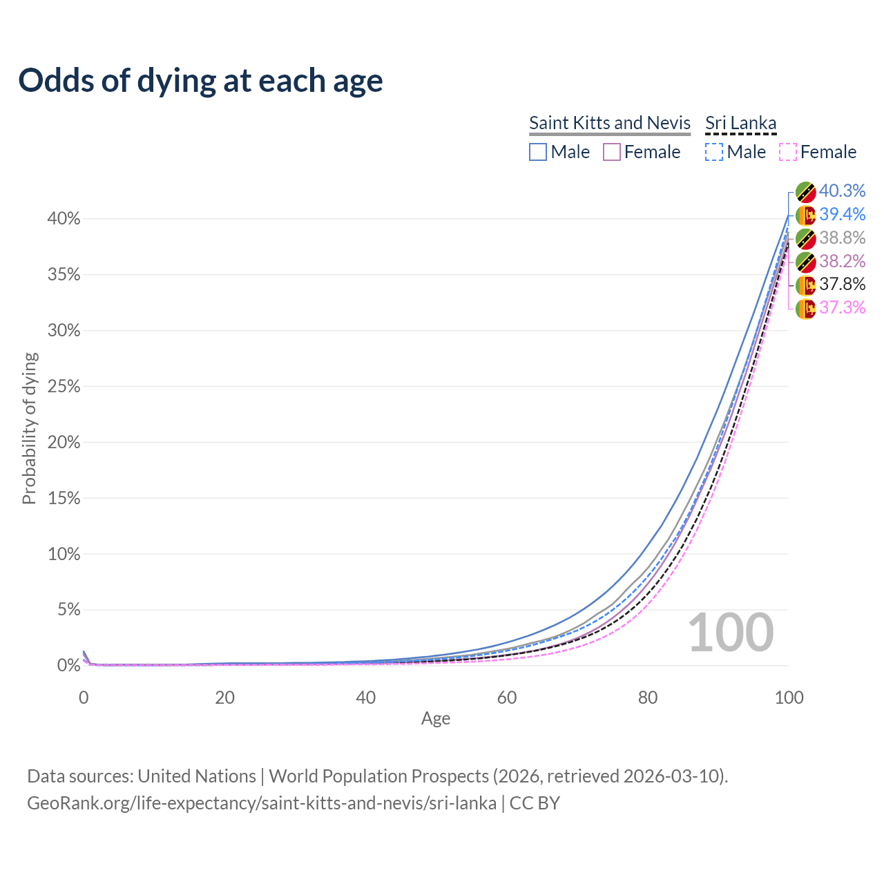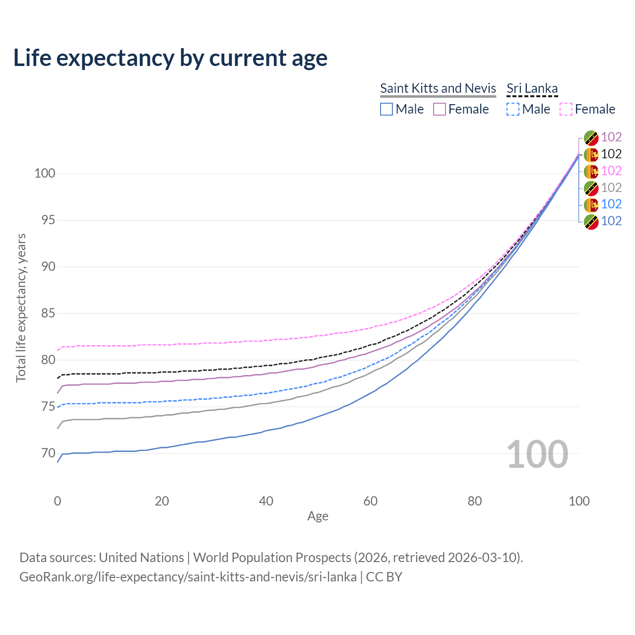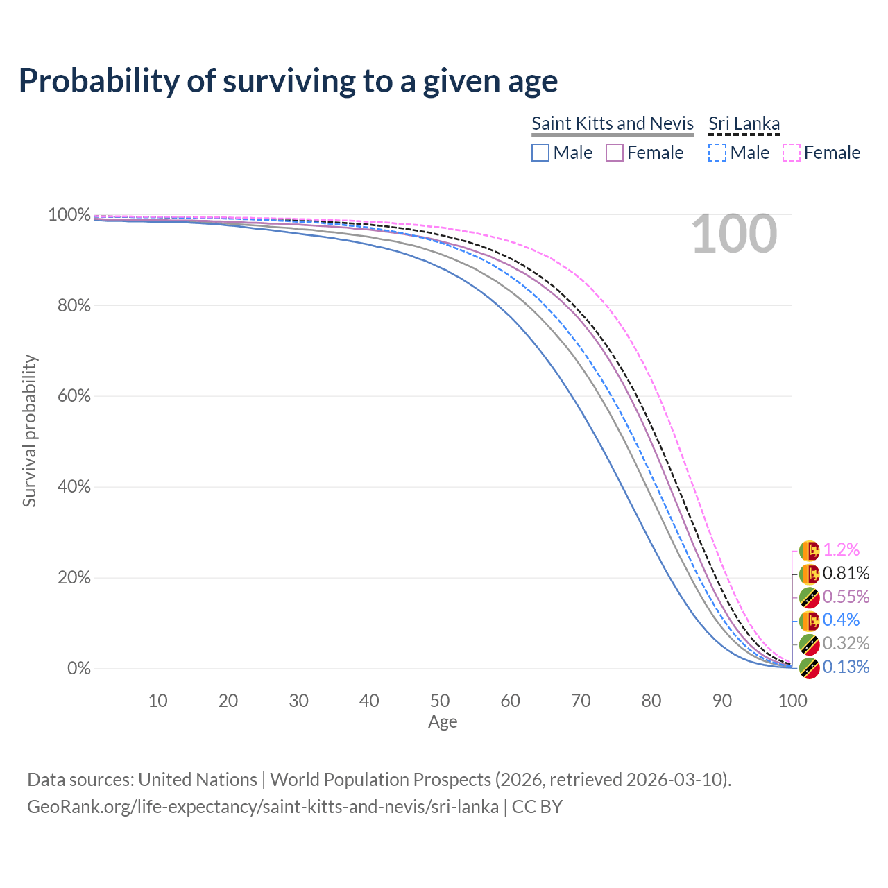 This life expectancy calculator shows the odds of living to 100, 95, 90, and below based on current age for both males and females in Saint Kitts and Nevis and Sri Lanka, along with mean and median age of death. The calculations are based on the 2026 life tables (actuarial tables) from the UN World Population Prospects.