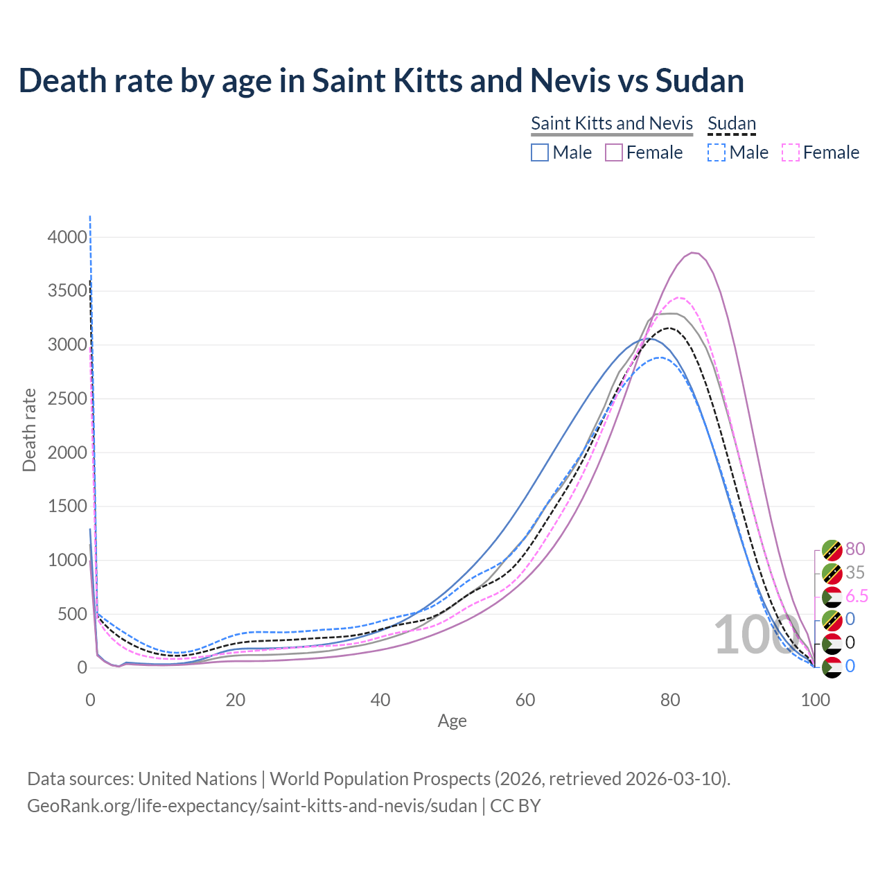 In Saint Kitts and Nevis, the most common age of death is 80, compared to 0 in Sudan. The median age of death is 76.3 in Saint Kitts and Nevis and 74.1 in Sudan, meaning only half of each cohort is expected to live past that age.