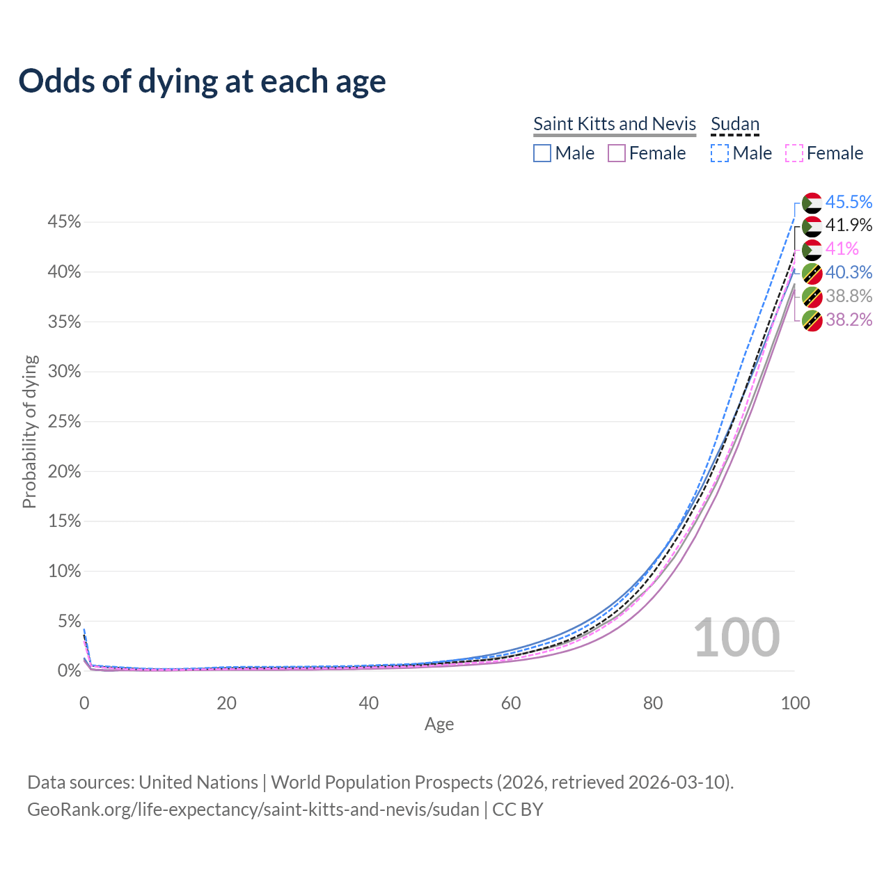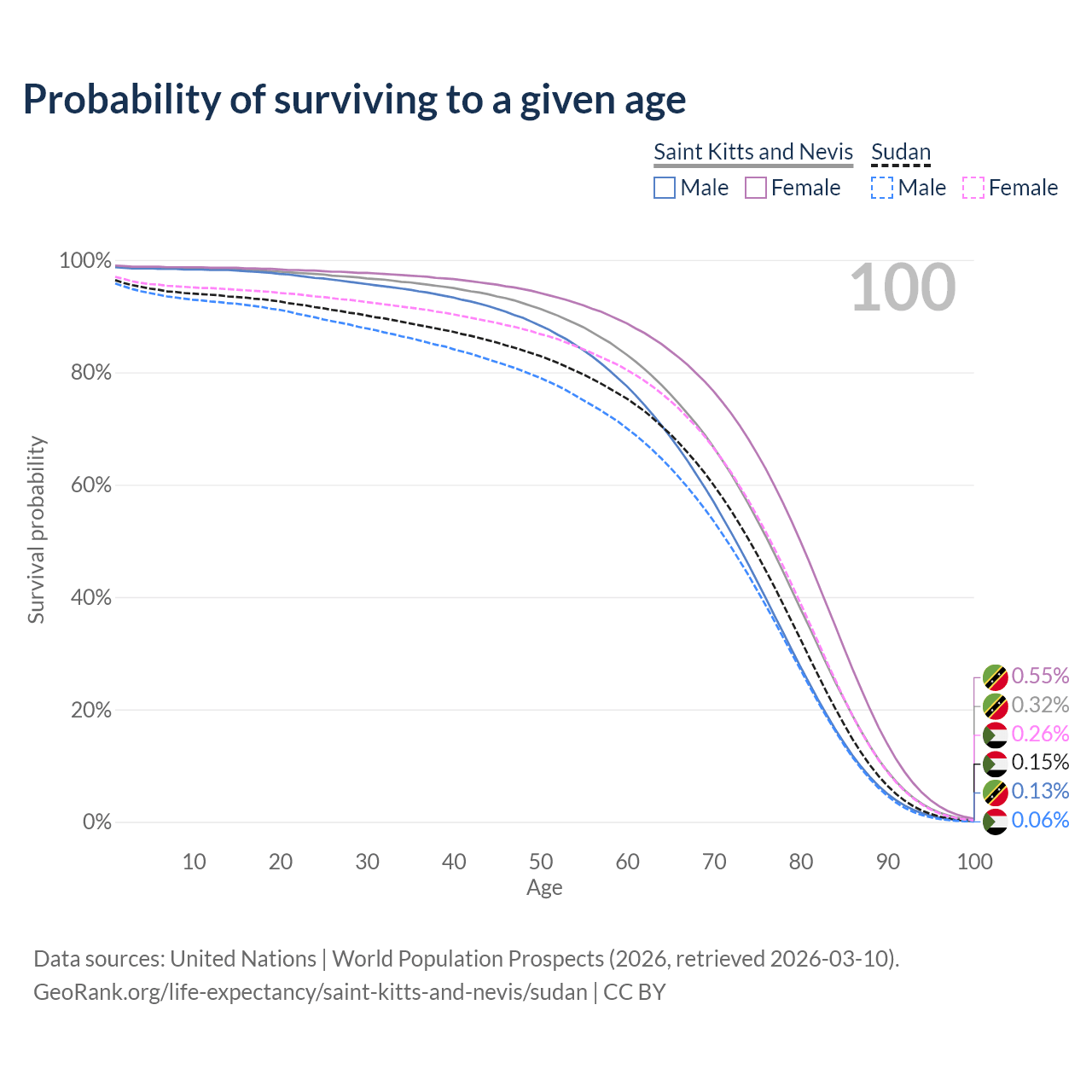 This life expectancy calculator shows the odds of living to 100, 95, 90, and below based on current age for both males and females in Saint Kitts and Nevis and Sudan, along with mean and median age of death. The calculations are based on the 2026 life tables (actuarial tables) from the UN World Population Prospects.