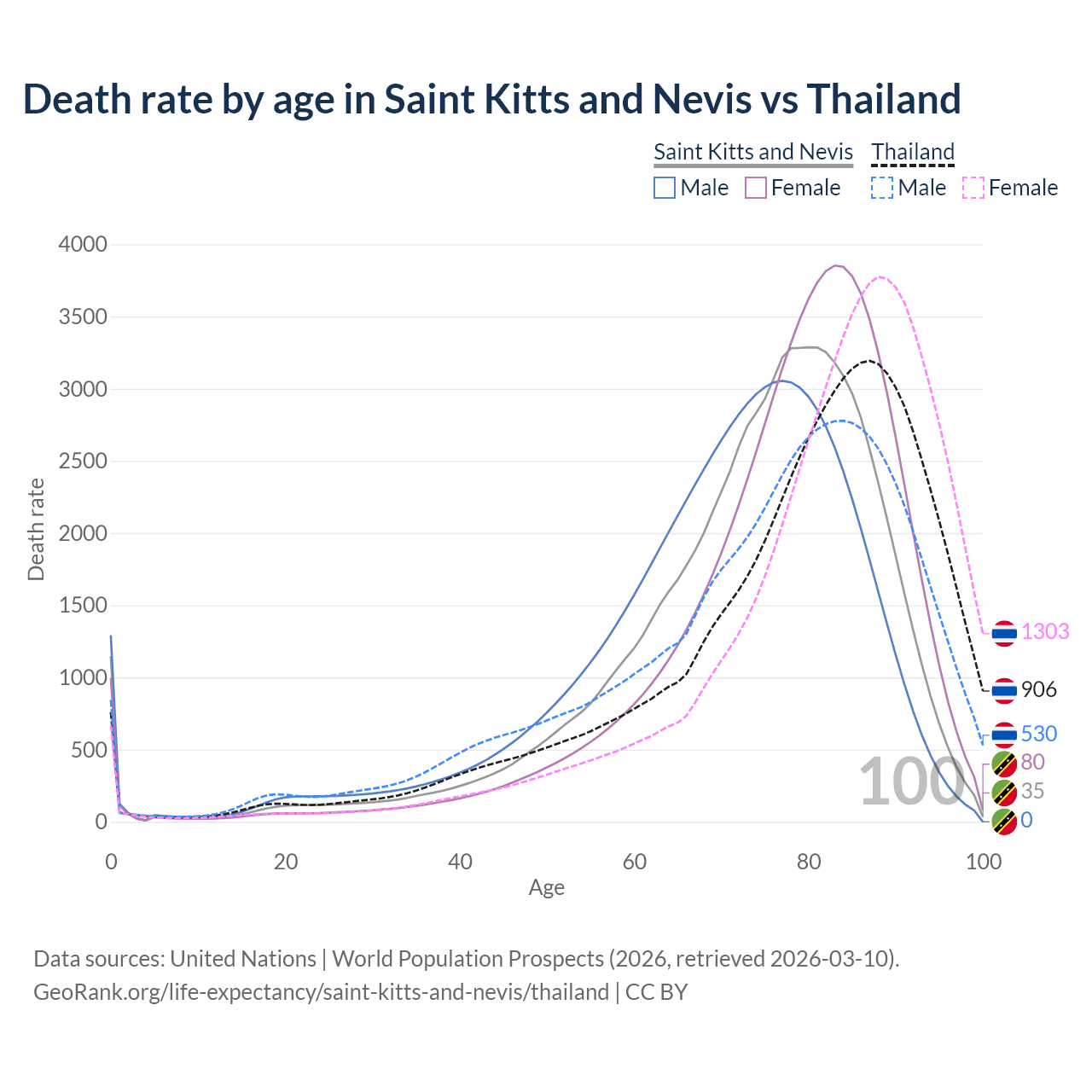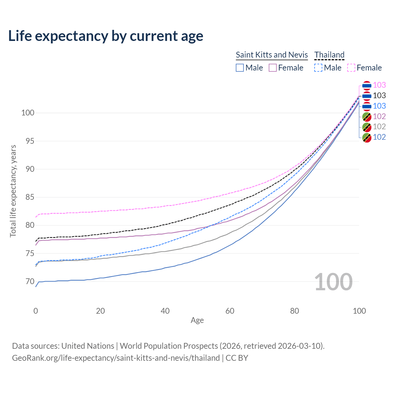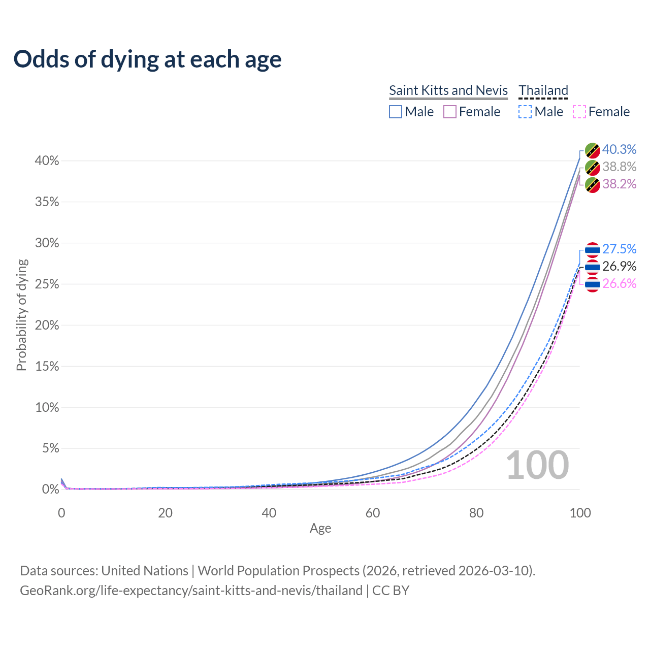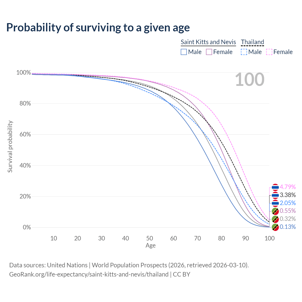This life expectancy calculator shows the odds of living to 100, 95, 90, and below based on current age for both males and females in Saint Kitts and Nevis and Thailand, along with mean and median age of death. The calculations are based on the 2026 life tables (actuarial tables) from the UN World Population Prospects.