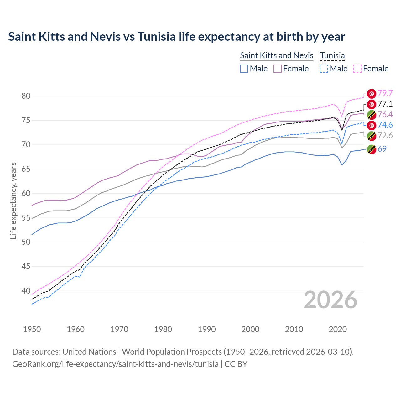 GeoRank.org/life-expectancy/saint-kitts-and-nevis/tunisia | CC BY