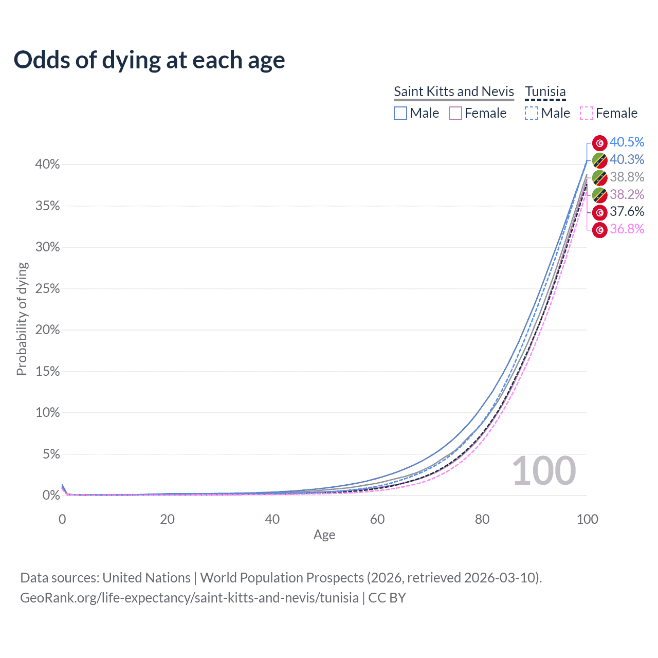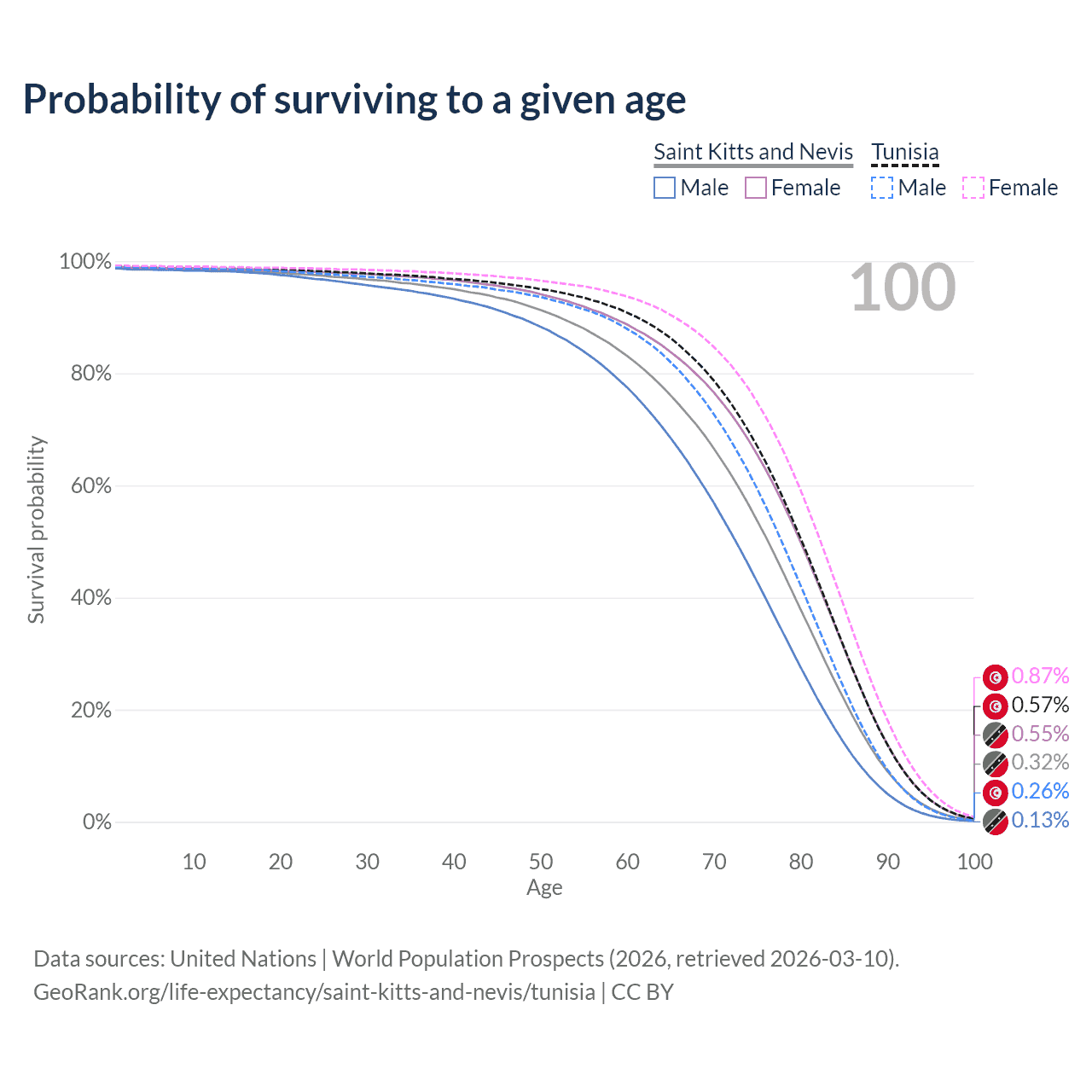 This life expectancy calculator shows the odds of living to 100, 95, 90, and below based on current age for both males and females in Saint Kitts and Nevis and Tunisia, along with mean and median age of death. The calculations are based on the 2026 life tables (actuarial tables) from the UN World Population Prospects.