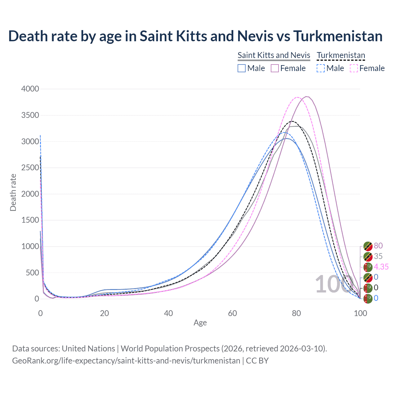 In Saint Kitts and Nevis, the most common age of death is 80, compared to 79 in Turkmenistan. The median age of death is 76.3 in Saint Kitts and Nevis and 75.1 in Turkmenistan, meaning only half of each cohort is expected to live past that age.