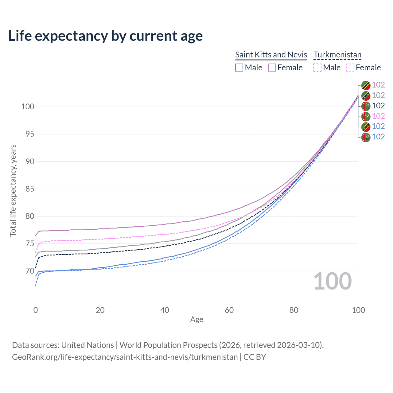 This life expectancy calculator shows the odds of living to 100, 95, 90, and below based on current age for both males and females in Saint Kitts and Nevis and Turkmenistan, along with mean and median age of death. The calculations are based on the 2026 life tables (actuarial tables) from the UN World Population Prospects.