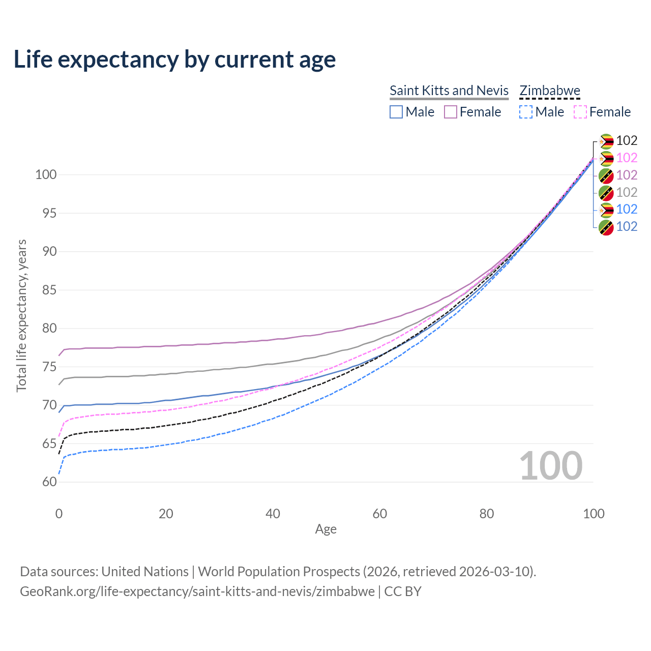 This life expectancy calculator shows the odds of living to 100, 95, 90, and below based on current age for both males and females in Saint Kitts and Nevis and Zimbabwe, along with mean and median age of death. The calculations are based on the 2026 life tables (actuarial tables) from the UN World Population Prospects.