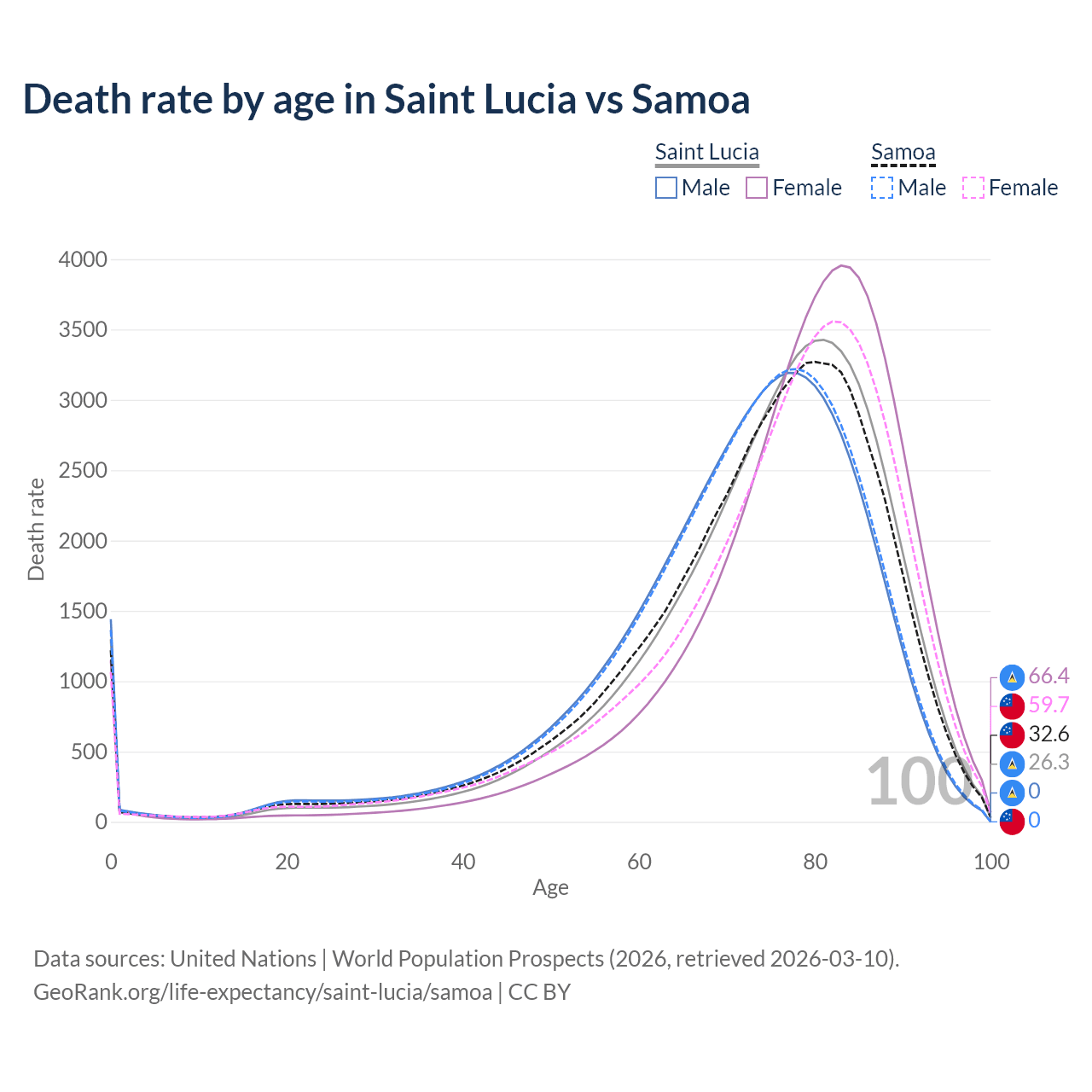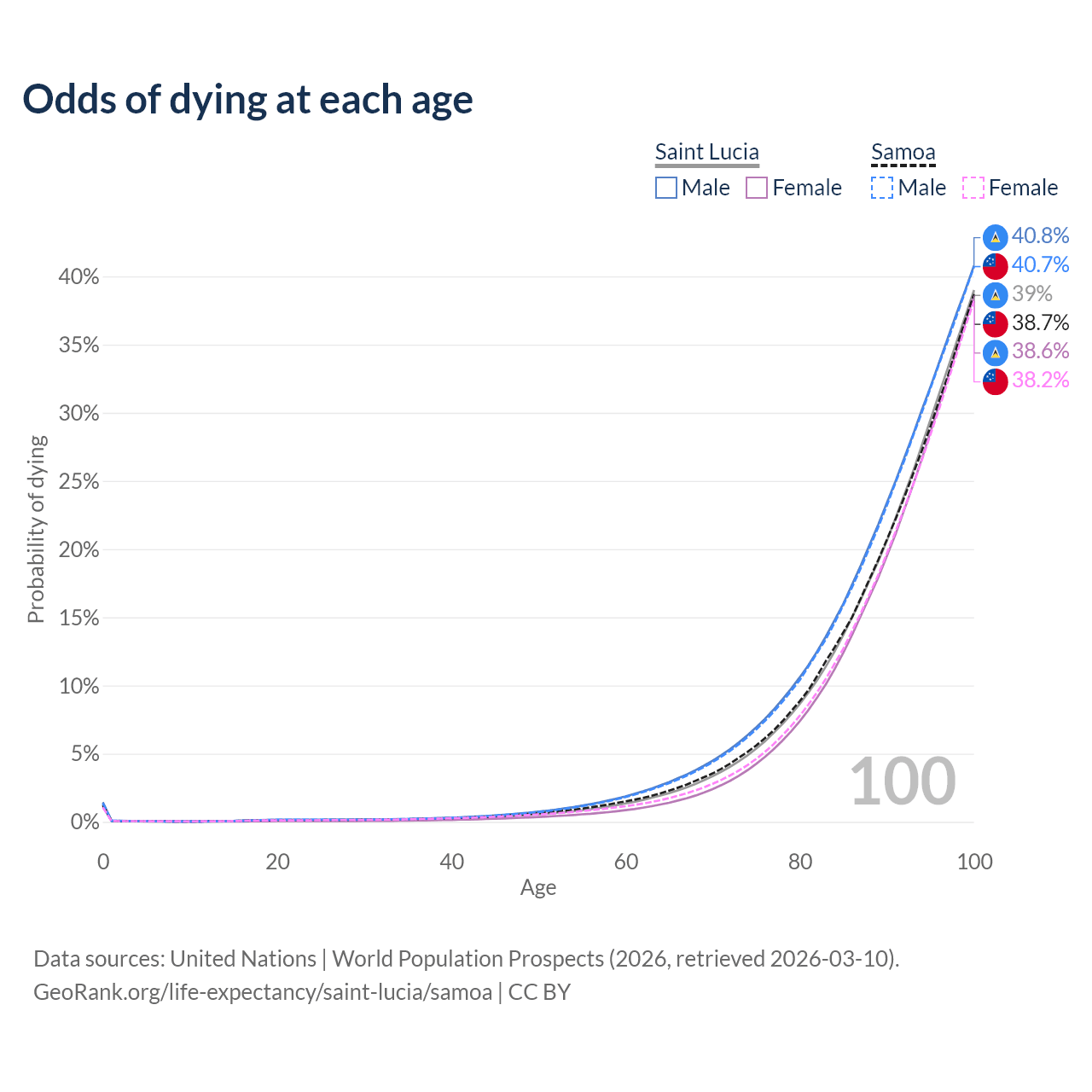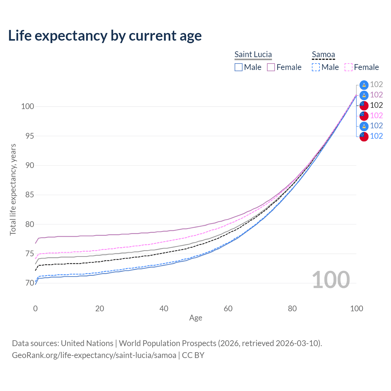 This life expectancy calculator shows the odds of living to 100, 95, 90, and below based on current age for both males and females in Saint Lucia and Samoa, along with mean and median age of death. The calculations are based on the 2026 life tables (actuarial tables) from the UN World Population Prospects.