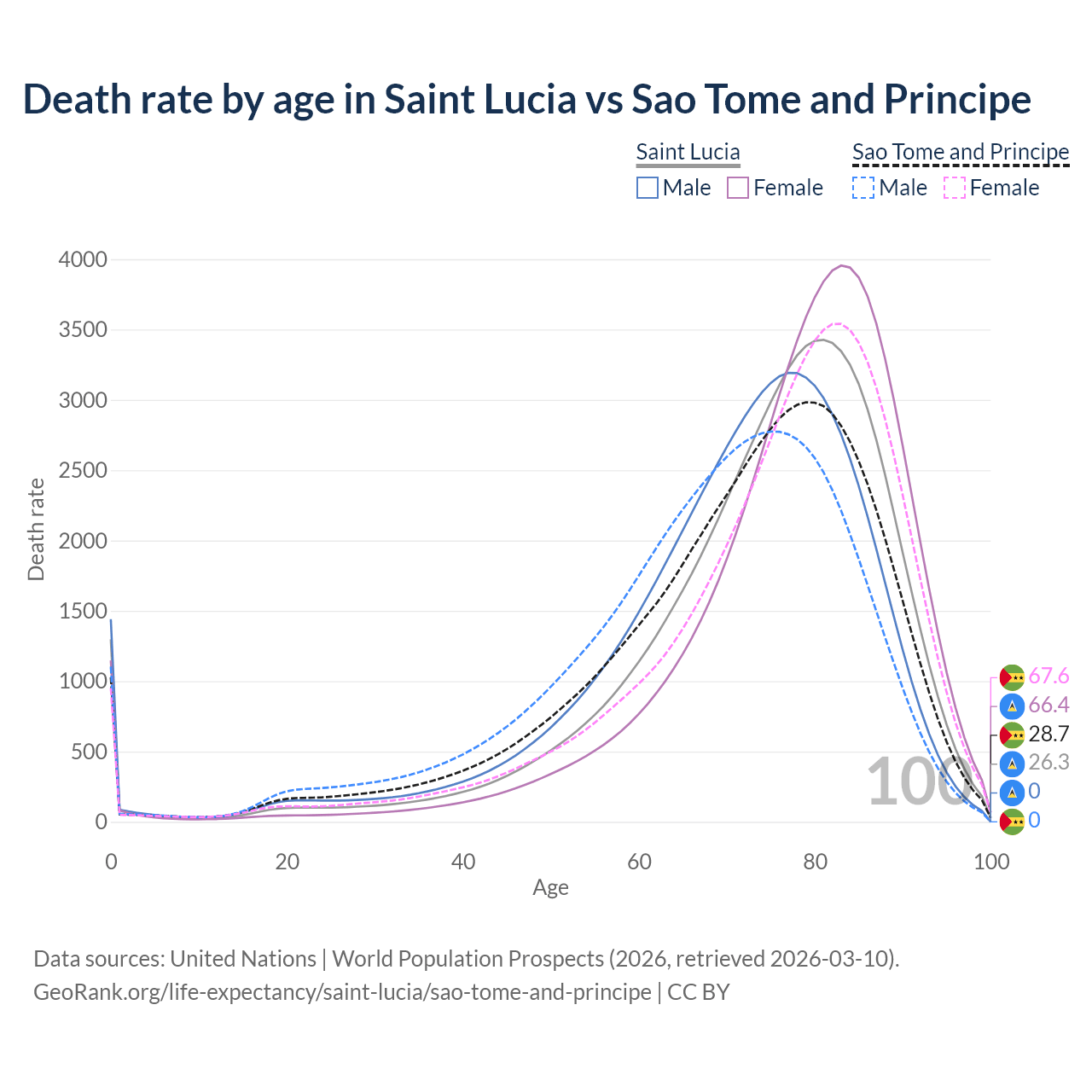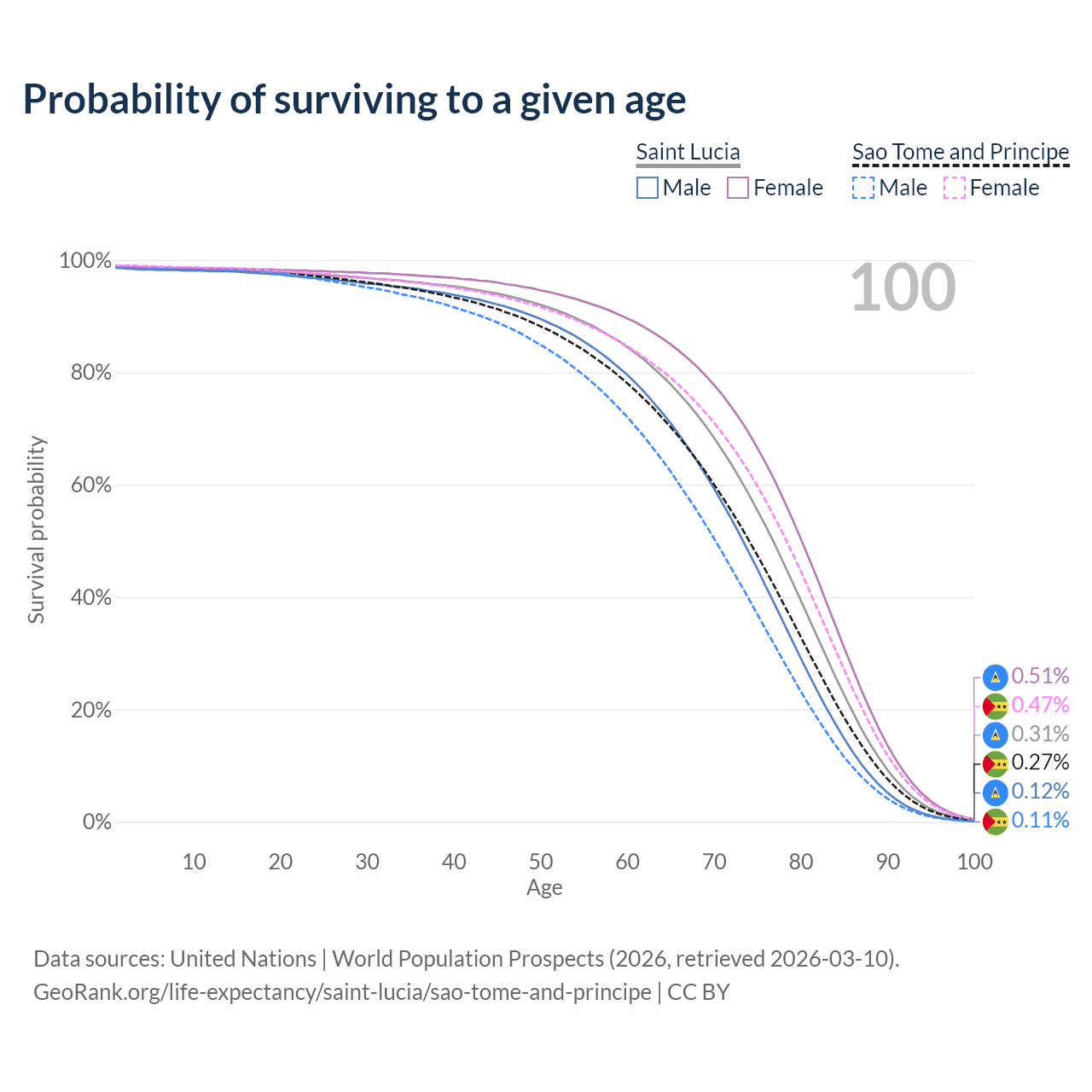 This life expectancy calculator shows the odds of living to 100, 95, 90, and below based on current age for both males and females in Saint Lucia and Sao Tome and Principe, along with mean and median age of death. The calculations are based on the 2026 life tables (actuarial tables) from the UN World Population Prospects.