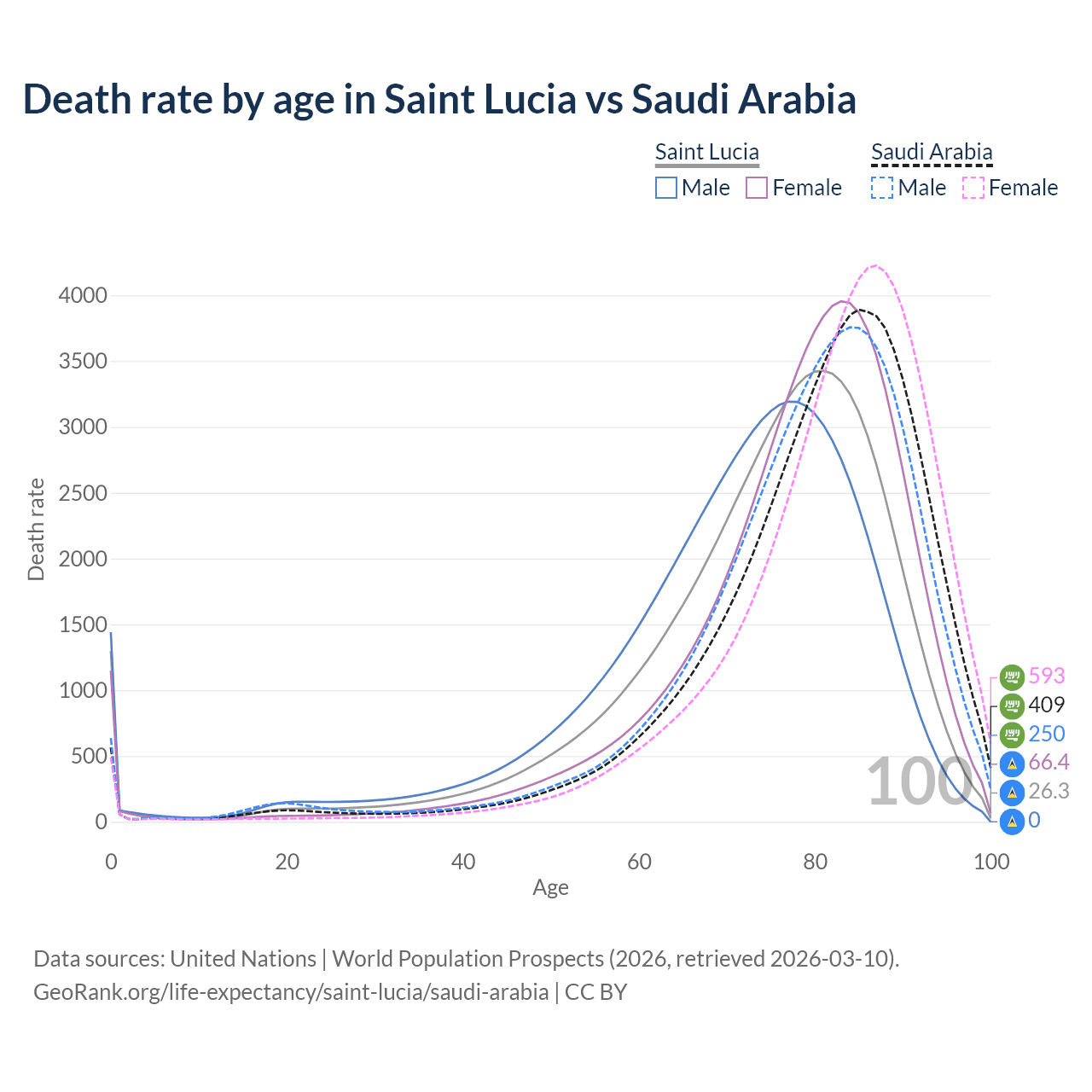 In Saint Lucia, the most common age of death is 81, compared to 85 in Saudi Arabia. The median age of death is 76.8 in Saint Lucia and 82.5 in Saudi Arabia, meaning only half of each cohort is expected to live past that age.