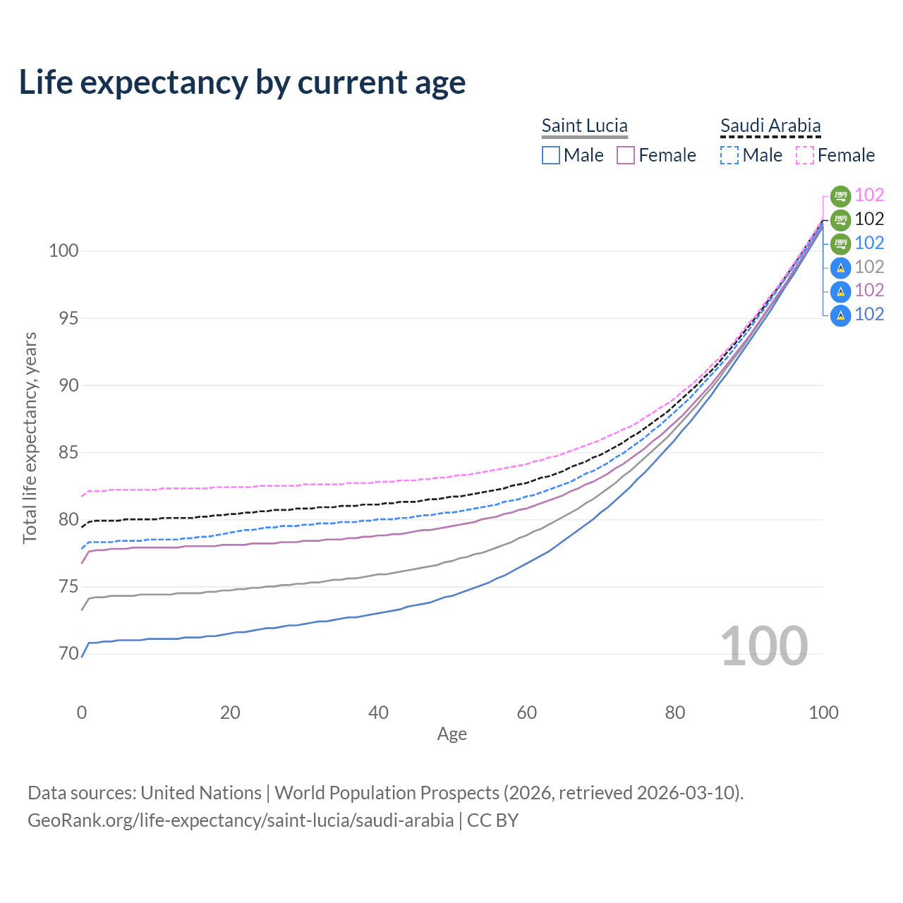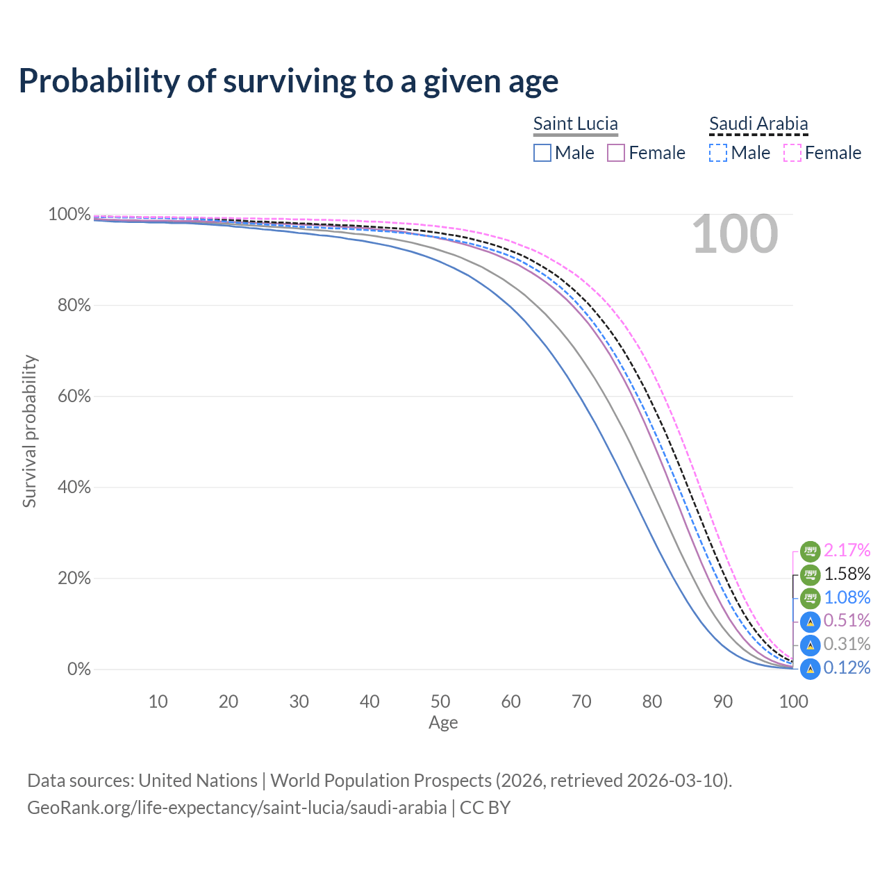 This life expectancy calculator shows the odds of living to 100, 95, 90, and below based on current age for both males and females in Saint Lucia and Saudi Arabia, along with mean and median age of death. The calculations are based on the 2026 life tables (actuarial tables) from the UN World Population Prospects.