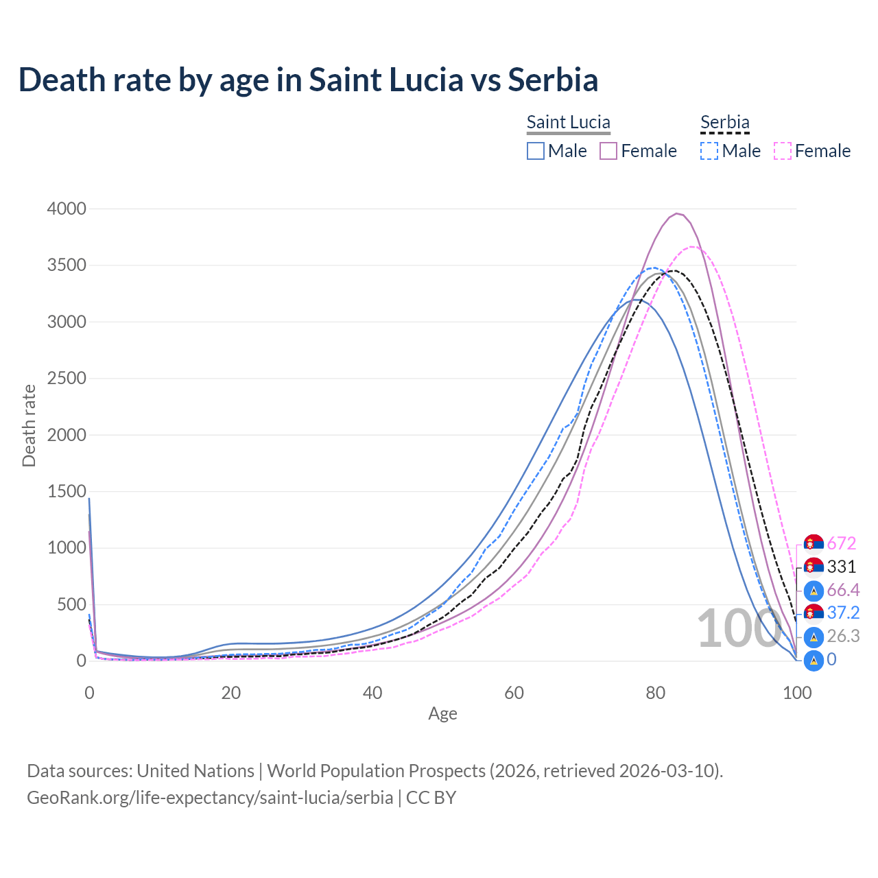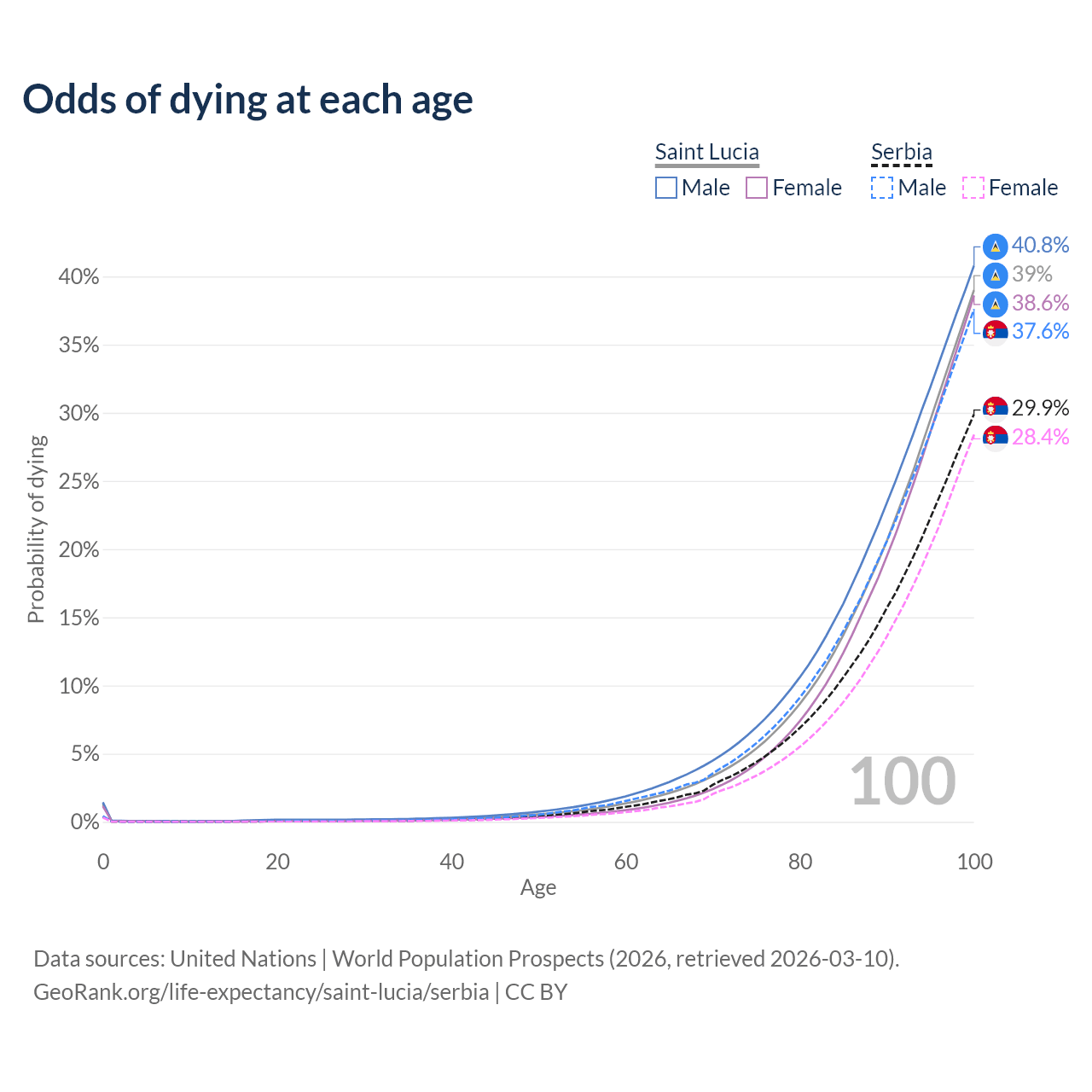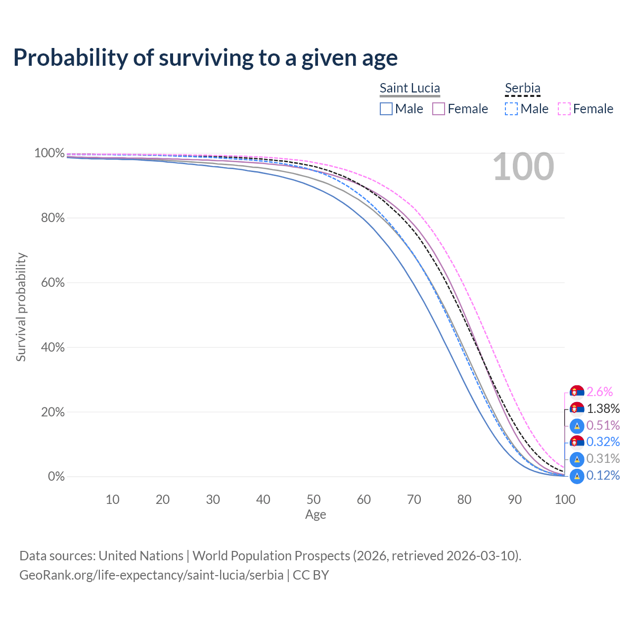This life expectancy calculator shows the odds of living to 100, 95, 90, and below based on current age for both males and females in Saint Lucia and Serbia, along with mean and median age of death. The calculations are based on the 2026 life tables (actuarial tables) from the UN World Population Prospects.